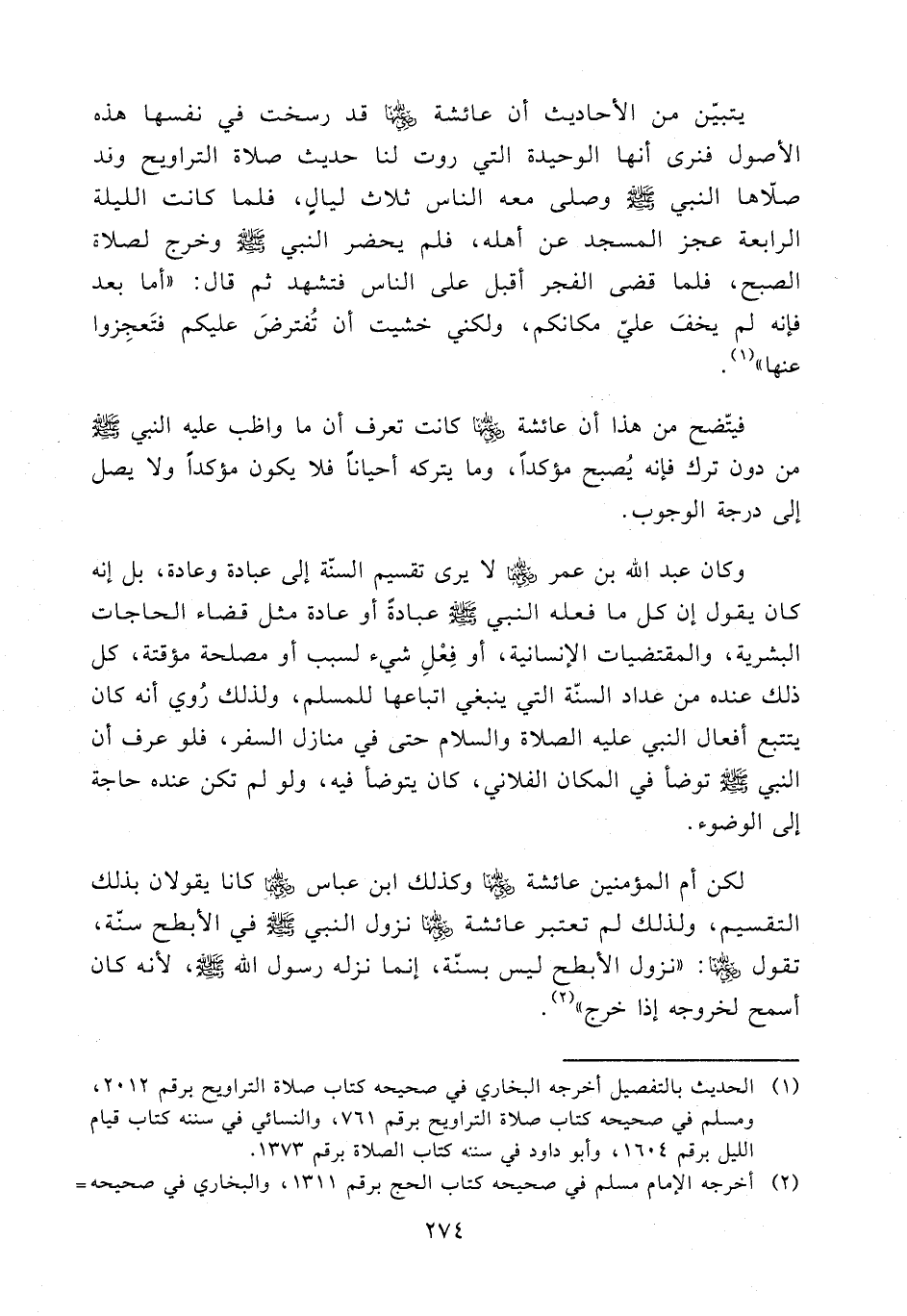 فيتضح من هذا أن عائشة (ض) كانت تعرف أن ما واظب عليه النبي - صلى الله عليه وسلم - من دون ترك فإنه يصبح مؤكدا، وما يتركه أحيانا فلا يكون مؤكدا ولا يصل إلى درجة الوجوب.