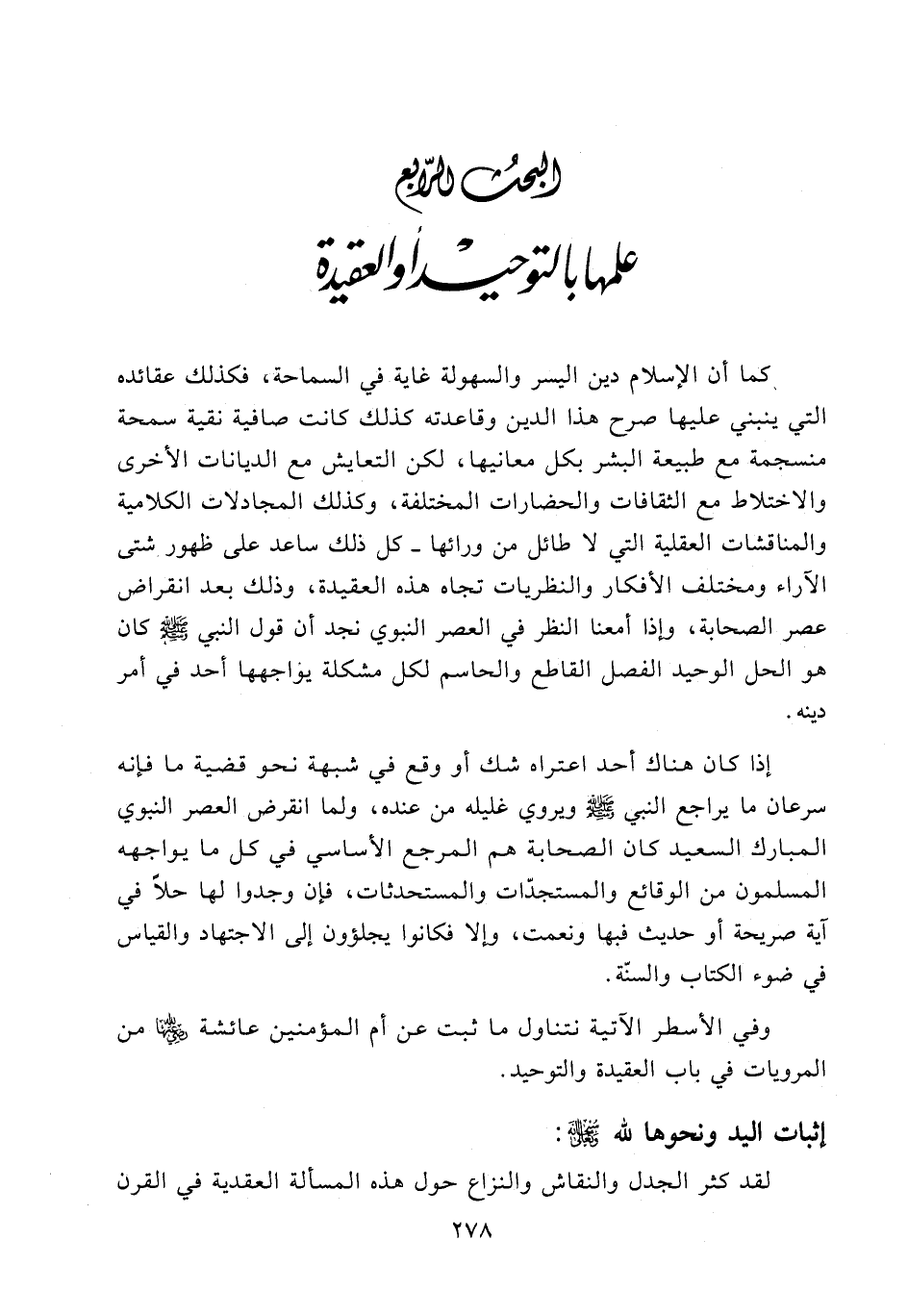 كما أن الإسلام دين اليسر والسهولة غاية في السماحة، فكذلك عقائده التي ينبني عليها صرح هذا الدين وقاعدته كذلك كانت صافية نقية سمحة منسجمة مع طبيعة البشر بكل معانيها، لكن التعايش مع الديانات الأخرى والاختلاط مع الثقافات والحضارات المختلفة، وكذلك المجادلات الكلامية والمناقشات العقلية التي لا طائل من ورائها - كل ذلك ساعد على ظهور شتى الآراء ومختلف الأفكار والنظريات تجاه هذه العقيدة، وذلك بعد انقراض عصر الصحابة، وإذا أمعنا النظر في العصر النبوي نجد أن قول النبي - صلى الله عليه وسلم - كان هو الحل الوحيد الفصل القاطع والحاسم لكل مشكلة يواجهها أحد في أمر دينه.