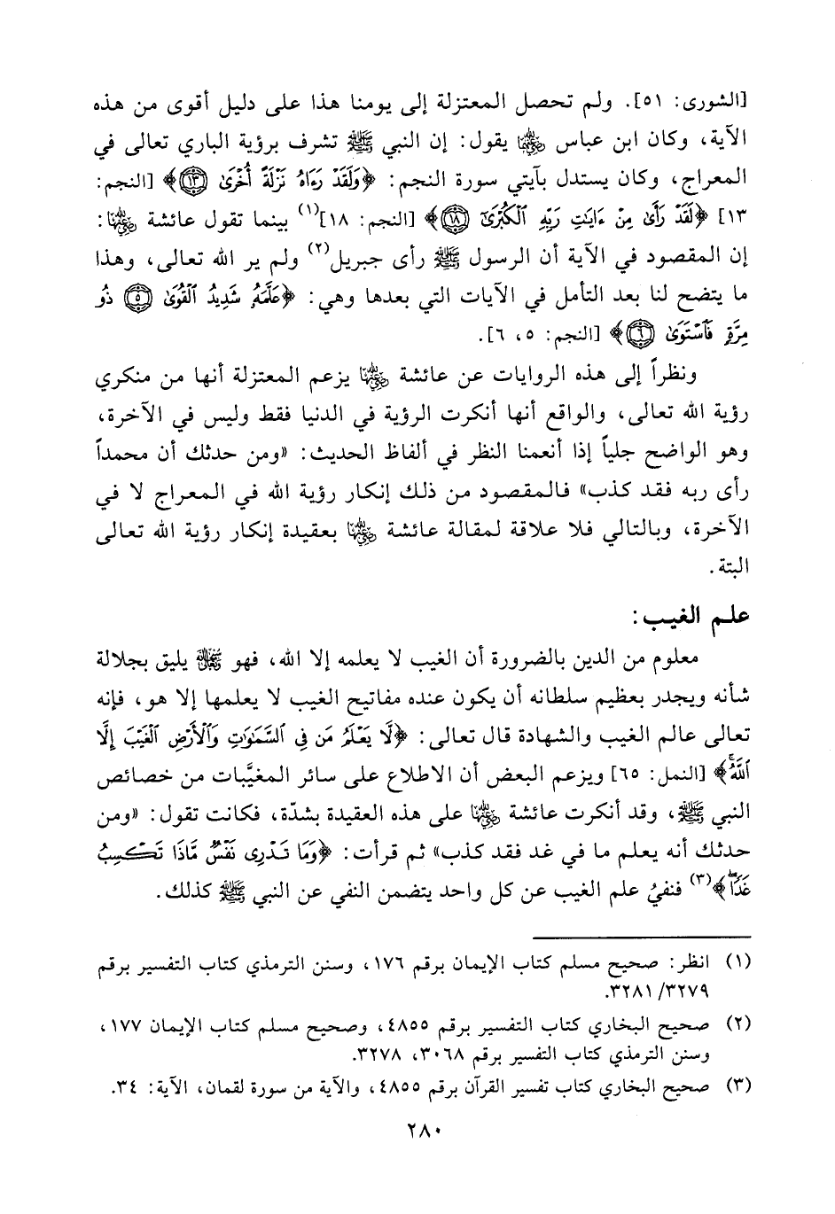 [الشورى: 451] ولم تحصل المعتزلة إلى يومنا هذا على دليل أقوى من هذه الآية، وكان ابن عباس (ض) يقول: إن النبي - صلى الله عليه وسلم - تشرف برؤية الباري تعالى في المعراج، وكان يستدل بآيتي سورة النجم: {وَلَقَدْ رَآهُ نَزْلَةً أُخْرَى} [النجم: 13] {لَقَدْ رَأَى مِنْ آيَاتِ رَبِّهِ الْكُبْرَى} [النجم: 18] (¬1) بينما تقول عائشة (ض): إن المقصود في الآية أن الرسول - صلى الله عليه وسلم - رأى جبريل (¬2) ولم ير الله تعالى، وهذا ما يتضح لنا بعد التأمل في الآيات التي بعدها وهي: {عَلَّمَهُ شَدِيدُ الْقُوَى (*) ذُو مِرَّةٍ فَاسْتَوَى} [النجم: 5، 6].