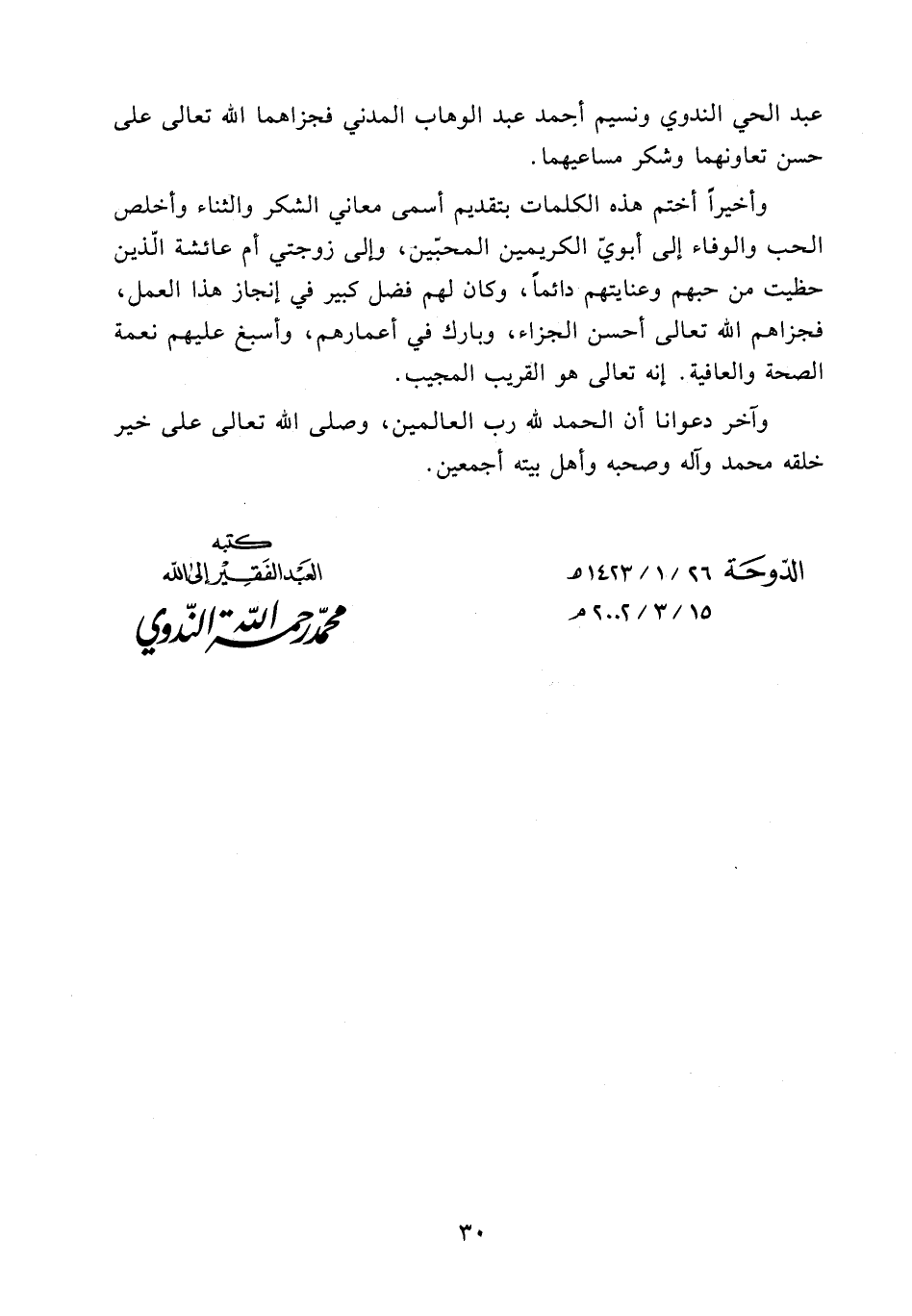 عبد الحي الندوي ونسيم أحمد عبد الوهاب المدني فجزاهما الله تعالى على حسن تعاونهما وشكر مساعيهما.