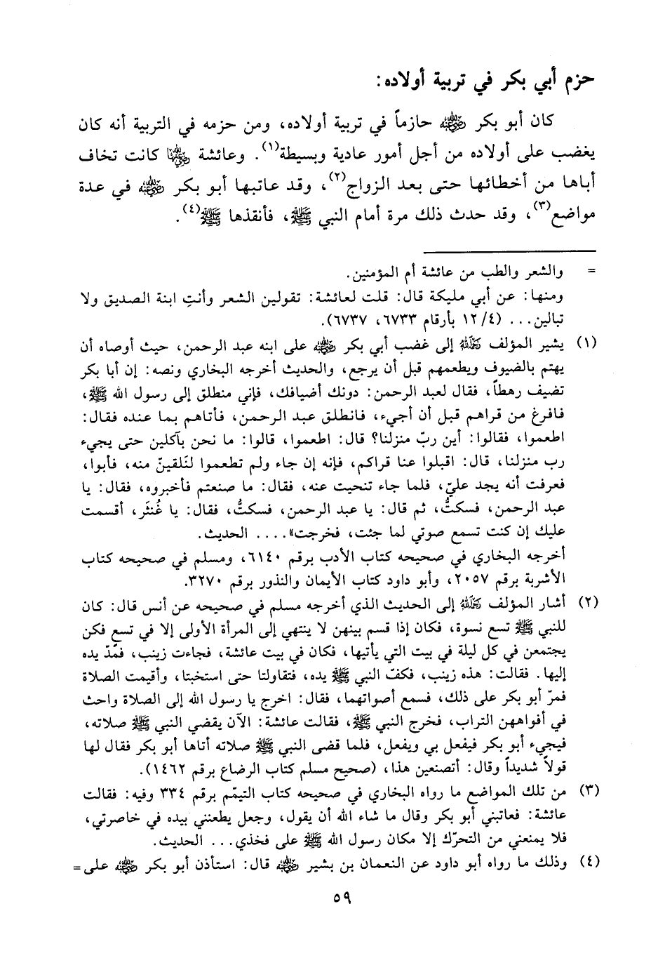 كان أبو بكر حازما في تربية أولاده، ومن حزمه في التربية أنه كان يغضب على أولاده من أجل أمور عادية وبسيطة (¬1). وعائشة (ض) كانت تخاف أباها من أخطائها حتى بعد الزواج (¬2)، وقد عاتبها أبو بكر (ض) في عدة مواضع (¬3)، وقد حدث ذلك مرة أمام النبي - صلى الله عليه وسلم -، فأنقذها - صلى الله عليه وسلم - (¬4).