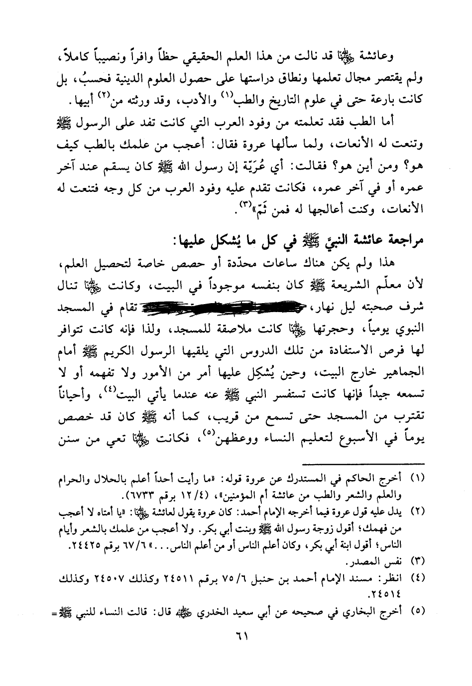(¬1) أخرج الحاكم في المستدرك عن عروة قوله: ((ما رأيت أحدا أعلم بالحلال والحرام والعلم والشعر والطب من عائشة أم المؤمنين))، (12/ 4 برقم 6733).