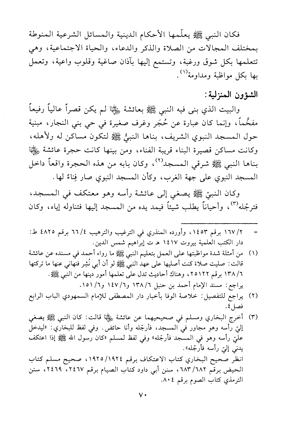 (¬1) من أمثلة شدة مواظبتها على العمل بتعليم النبي - صلى الله عليه وسلم - ما رواه أحمد في مسنده عن عائشة قالت: صليت صلاة كنت أصليها على عهد النبي - صلى الله عليه وسلم - لو أن أبي نشر فنهاني عنها ما تركتها 138/ 6 برقم 25122، وهناك أحاديث تدل على تعلمها أمور دينها من النبي - صلى الله عليه وسلم -. يراجع: مسند الإمام أحمد بن حنبل 138/ 6 و147/ 6 و6/ 151.
