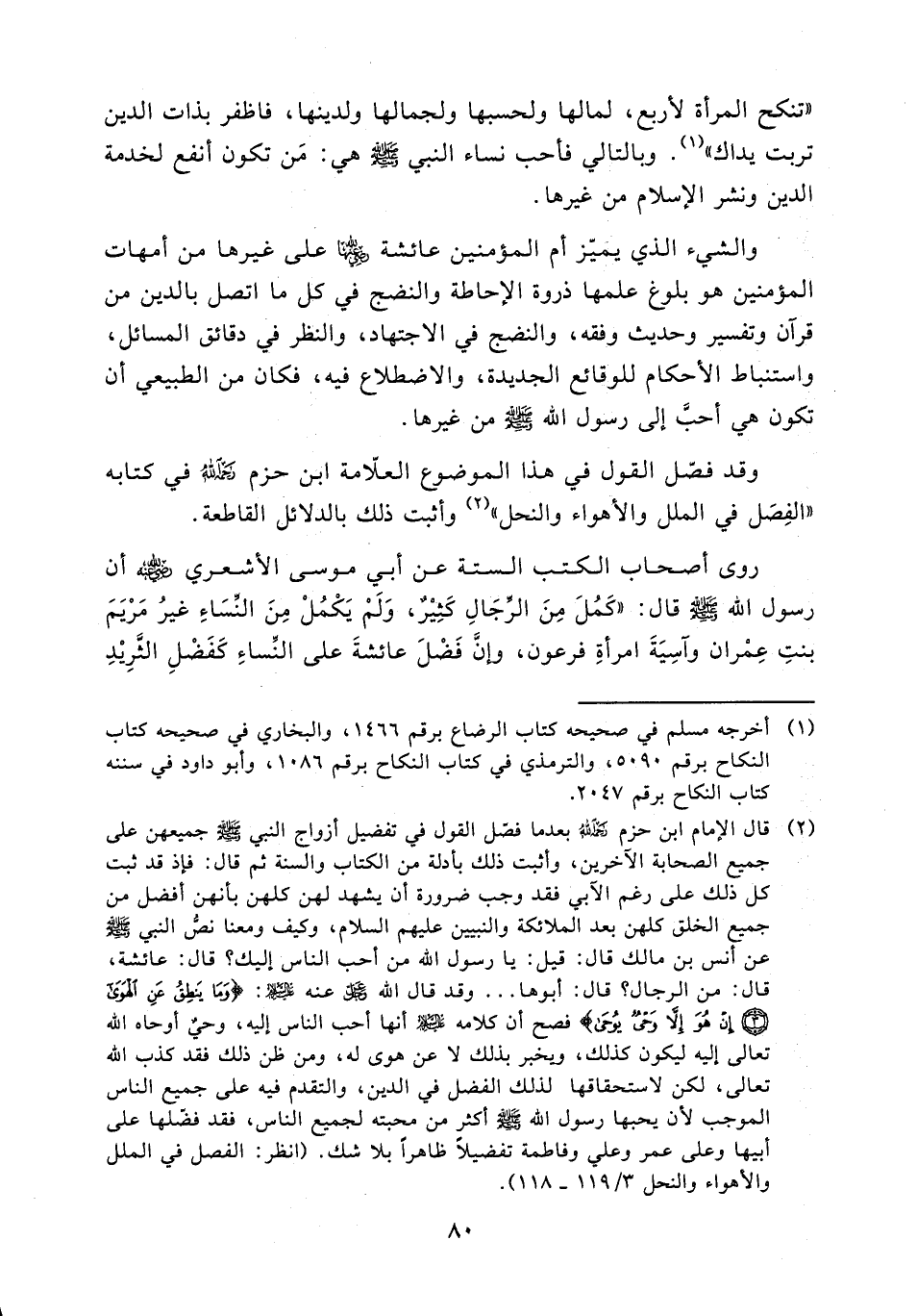 (¬2) قال الإمام ابن حزم (ح) بعدما فصل القول في تفضيل أزواج النبي - صلى الله عليه وسلم - جميعهن على جميع الصحابة الآخرين، وأثبت ذلك بأدلة من الكتاب والسنة ثم قال: فإذ قد ثبت كل ذلك على رغم الآبي فقد وجب ضرورة أن يشهد لهن كلهن بأنهن أفضل من جميع الخلق كلهن بعد الملائكة والنبيين عليهم السلام، وكيف ومعنا نص النبي - صلى الله عليه وسلم - عن أنس بن مالك قال: قيل: يا رسول الله من أحب الناس إليك؟ قال: عائشة،
