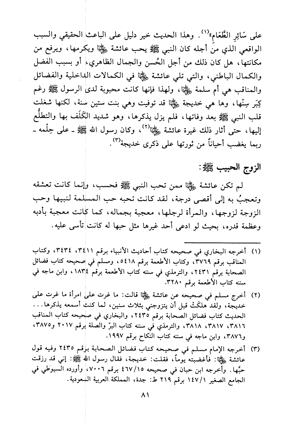 (¬3) أخرجه الإمام مسلم في صحيحه كتاب فضائل الصحابة برقم 2435 وفيه قول عائشة (ض): فأغضبته يوما، فقلت: خديجة، فقال رسول الله - صلى الله عليه وسلم -: إني قد رزقت حبها. وأخرجه ابن حبان في صحيحه 15/ 467 برقم 7006، وأورده السيوطي في الجامع الصغير 147/ 1 برقم 219 ط: جدة، المملكة العربية السعودية.