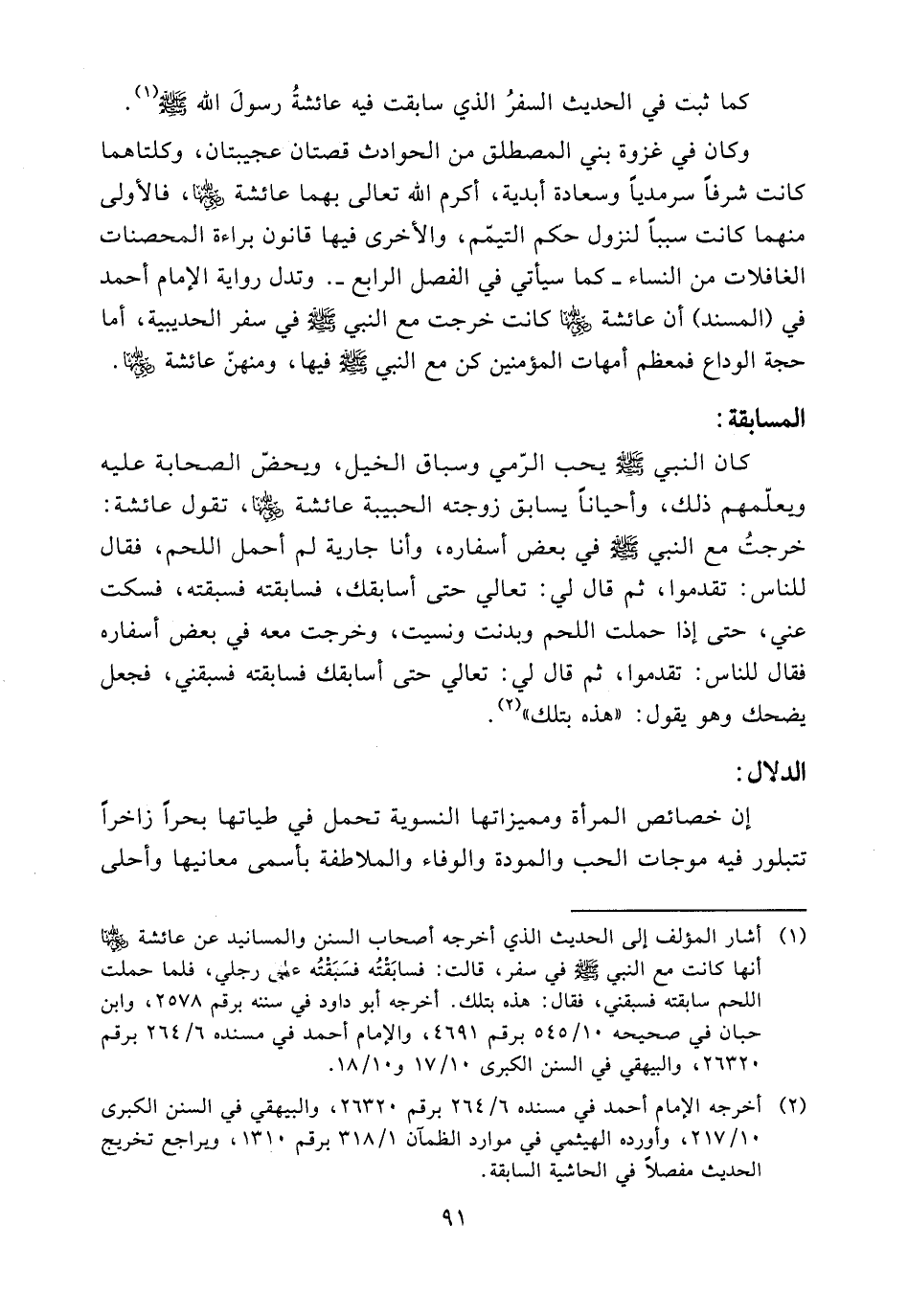 (¬1) أشار المؤلف إلى الحديث الذي أخرجه أصحاب السنن والمسانيد عن عائشة (ض) أنها كانت مع النبي - صلى الله عليه وسلم - في سفر، قالت: فسابقته فسبقته على رجلي، فلما حملت اللحم سابقته فسبقني، فقال: هذه بتلك. أخرجه أبو داود في سننه برقم 2578، وابن حبان في صحيحه 10/ 545 برقم 4691، والإمام أحمد في مسنده 264/ 6 برقم 26320، والبيهقي في السنن الكبرى 17/ 10 و18/ 10.