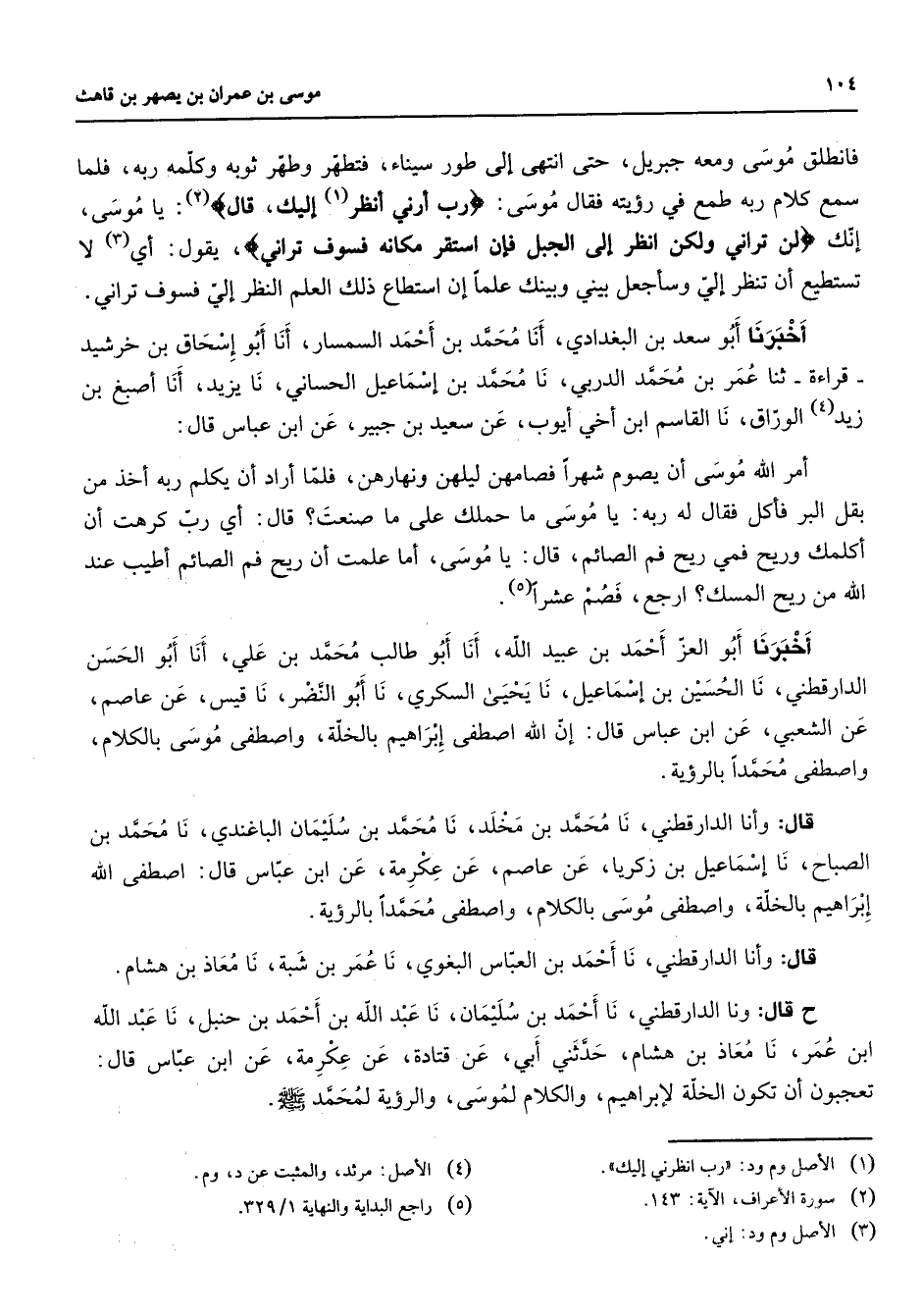 فانطلق موسى ومعه جبريل حتى انتهى إلى طور سيناء فتطهر وطهر ثوبه وكلمه ربه فلما سمع كلام ربه طمع في رؤيته فقال موسى " رب أرني أنظر (1) إليك قال " (2) يا موسى إنك " لن تراني ولكن انظر إلى الجبل فإن استقر مكانه فسوف تراني " يقول أي (3) لا تستطيع أن تنظر إلي وسأجعل بيني وبينك علما إن استطاع ذلك العلم النظر إلي فسوف تراني أخبرنا أبو سعد بن البغدادي أنا محمد بن أحمد السمسار أنا أبو إسحاق بن خرشيد قراءة ثنا عمر بن محمد الدربي نا محمد بن إسماعيل الحساني نا يزيد أنا أصبغ بن زيد (4) الوراق نا القاسم ابن أخي أيوب عن سعيد بن جبير عن ابن عباس قال أمر الله موسى أن يصوم شهرا فصامهن ليلهن ونهارهن فلما أراد أن يكلم ربه أخذ من بقل البر فأكل فقال له ربه يا موسى ما حملك على ما صنعت قال أي رب كرهت أن أكلمك وريح فمي ريح فم الصائم قال يا موسى أما علمت أن ريح فم الصائم أطيب عند الله من ريح المسك ارجع فصم عشرا (5) أخبرنا أبو العز أحمد بن عبيد الله أنا أبو طالب محمد بن علي أنا أبو الحسن الدارقطني نا الحسين بن إسماعيل نا يحيى السكري نا أبو النضر نا قيس عن عاصم عن الشعبي عن ابن عباس قال إن الله اصطفى إبراهيم بالخلة واصطفى موسى بالكلام واصطفى محمدا بالرؤية قال وأنا الدارقطني نا محمد بن مخلد نا محمد بن سليمان الباغندي نا محمد بن الصباح نا إسماعيل بن زكريا عن عاصم عن عكرمة عن ابن عباس قال اصطفى الله إبراهيم بالخلة واصطفى موسى بالكلام واصطفى محمدا بالرؤية قال وأنا الدارقطني نا أحمد بن العباس البغوي نا عمر بن شبه نا معاذ بن هشام ح وقال ونا الدارقطني نا أحمد بن سليمان نا عبد الله بن أحمد بن حنبل نا عبد الله ابن عمر نا معاذ بن هشام حدثني أبي عن قتادة عن عكرمة عن ابن عباس قال تعجبون أن تكون الخلة لإبراهيم والكلام لموسى والرؤية لمحمد (صلى الله عليه وسلم)