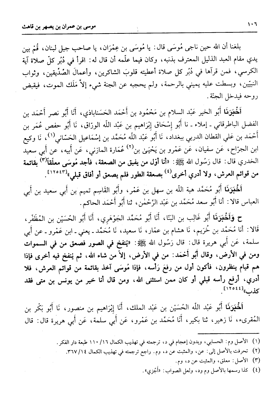 بلغنا أن الله حين ناجى موسى قال يا موسى بن عمران يا صاحب جبل لبنان قم بين يدي مقام العبد الذليل المعترف بذنبه وكان فيما علمه أن قال له اقرأ في دبر كل صلاة آية الكرسي فمن قرأها في دبر كل صلاة أعطيته قلوب الشاكرين وأعمال الصديقين وثواب النبيين وبسطت عليه يميني بالرحمة ولم يحجبه عن الجنة شئ إلا ملك الموت فيقبض روحه فيدخل الجنة أخبرنا أبو الخير عبد السلام بن محمود بن أحمد الحسناباذي أنا أبو نصر أحمد بن الفضل الباطرقاني إملاء نا أبو إسحاق إبراهيم بن عبد الله الوراق نا أبو حفص عمر بن أحمد بن علي القطان الدربي ببغداد نا أبو عبد الله محمد بن إسماعيل الحساني (1) نا وكيع ابن الجراح عن سفيان عن عمرو بن يحيى بن (2) عمارة المازني عن ابيه عن ابي سعيد الخدري قال قال رسول الله (صلى الله عليه وسلم) أنا أول من يفيق من الصعقة فأجد موسى معلقا (3) بقائمة من قوائم العرش ولا أدري أخرى (4) بصعقة الطور فلم يصعق أو أفاق قبلي أخبرنا أبو محمد هبة الله بن سهل بن عمر وابو القاسم تميم بن ابي سعيد بن أبي العباس قالا أنا أبو سعد محمد بن عبد الرحمن ثنا أبو أحمد الحاكم ح وأخبرنا أبو غالب بن البنا أنا أبو محمد الجوهري أنا أبو الحسين بن المظفر قالا أنا محمد بن خريم نا هشام بن عمار نا سعيد نا محمد يعني ابن عمرو عن أبي سلمة عن ابي هريرة قال قال رسول الله (صلى الله عليه وسلم) ينفخ في الصور فصعق من في السموات ومن في الأرض وقال أبو أحمد من في الأرض إلا من شاء الله ثم ينفخ فيه أخرى فإذا هم قيام ينظرون فأكون أول من رفع رأسه فإذا موسى آخذ بقائمة من قوائم العرش فلا أدري ارفع رأسه قبلي أو كان ممن استثنى الله ومن قال أنا خير من يونس بن متى فقد كذب أخبرنا أبو عبد الله الحسين بن عبد الملك أنا إبراهيم بن منصور نا أبو بكر بن المقرئ نا زهير ثنا بكير أنا محمد بن عمرو عن ابي سلمة عن أبي هريرة قال قال