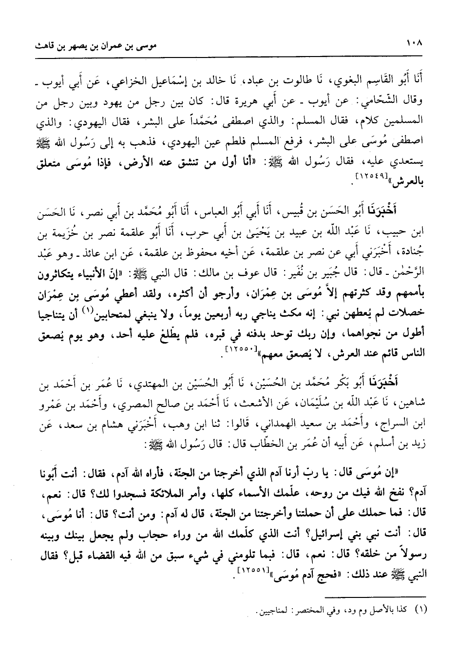 أنا أبو القاسم البغوي نا طالوت بن عباد نا خالد بن إسماعيل الخزاعي عن ابي أيوب وقال الشحامي عن أيوب عن أبي هريرة قال كان بين رجل من يهود وبين رجل من المسلمين كلام فقال المسلم والذي اصطفى محمدا على البشر فقال اليهودي والذي اصطفى موسى على البشر فرفع المسلم فلطم عين اليهودي فذهب به إلى رسول الله (صلى الله عليه وسلم) يستعدي عليه فقال رسول الله (صلى الله عليه وسلم) أنا أول من تنشق عنه الأرض فإذا موسى متعلق بالعرش أخبرنا أبو الحسن بن قبيس أنا أبي أبو العباس أنا أبو محمد بن أبي نصر نا الحسن ابن حبيب نا عبد الله بن عبيد بن يحيى بن أبي حرب أنا أبو علقمة نصر بن خزيمة بن جنادة أخبرني أبي عن نصر بن علقمة عن أخيه محفوظ بن علقمة عن ابن عائذ وهو عبد الرحمن قال قال جبير بن نفير قال عوف بن مالك قال النبي (صلى الله عليه وسلم) إن الأنبياء يتكاثرون بأممهم وقد كثرتهم إلا موسى بن عمران وأرجو أن أكثره ولقد أعطي موسى بن عمران خصلات لم يعطهن نبي إنه مكث يناجي ربه أربعين يوما ولا ينبغي لمتحابين (1) أن يتناجيا أطول من نجواهما وإن ربك توحد بدفنه في قبره فلم يطلع عليه أحد وهو يوم يصعق الناس قائم عند العرش لا يصعق معهم أخبرنا أبو بكر محمد بن الحسين نا أبو الحسين بن المهتدي نا عمر بن أحمد بن شاهين نا عبد الله بن سليمان عن الأشعث نا أحمد بن صالح المصري واحمد بن عمرو ابن السراج وأحمد بن سعيد الهمداني قالوا ثنا ابن وهب أخبرني هشام بن سعد عن زيد بن أسلم عن أبيه أن عمر بن الخطاب قال قال رسول الله (صلى الله عليه وسلم) إن موسى قال يا رب أرنا آدم الذي أخرجنا من الجنة فأراه الله آدم فقال أنت أبونا آدم نفخ الله فيك من روحه علمك الأسماء كلها وأمر الملائكة فسجدوا لك قال نعم قال فما حملك على أن حملتنا وأخرجتنا من الجنة قال له آدم ومن أنت قال أنا موسى قال أنت نبي بني إسرائيل أنت الذي كلمك الله من وراء حجاب ولم يجعل بينك وبينه رسولا من خلقه قال نعم قال فبما تلومني في شئ سبق من الله فيه القضاء قبل فقال النبي (صلى الله عليه وسلم) عند ذلك فحج آدم موسى