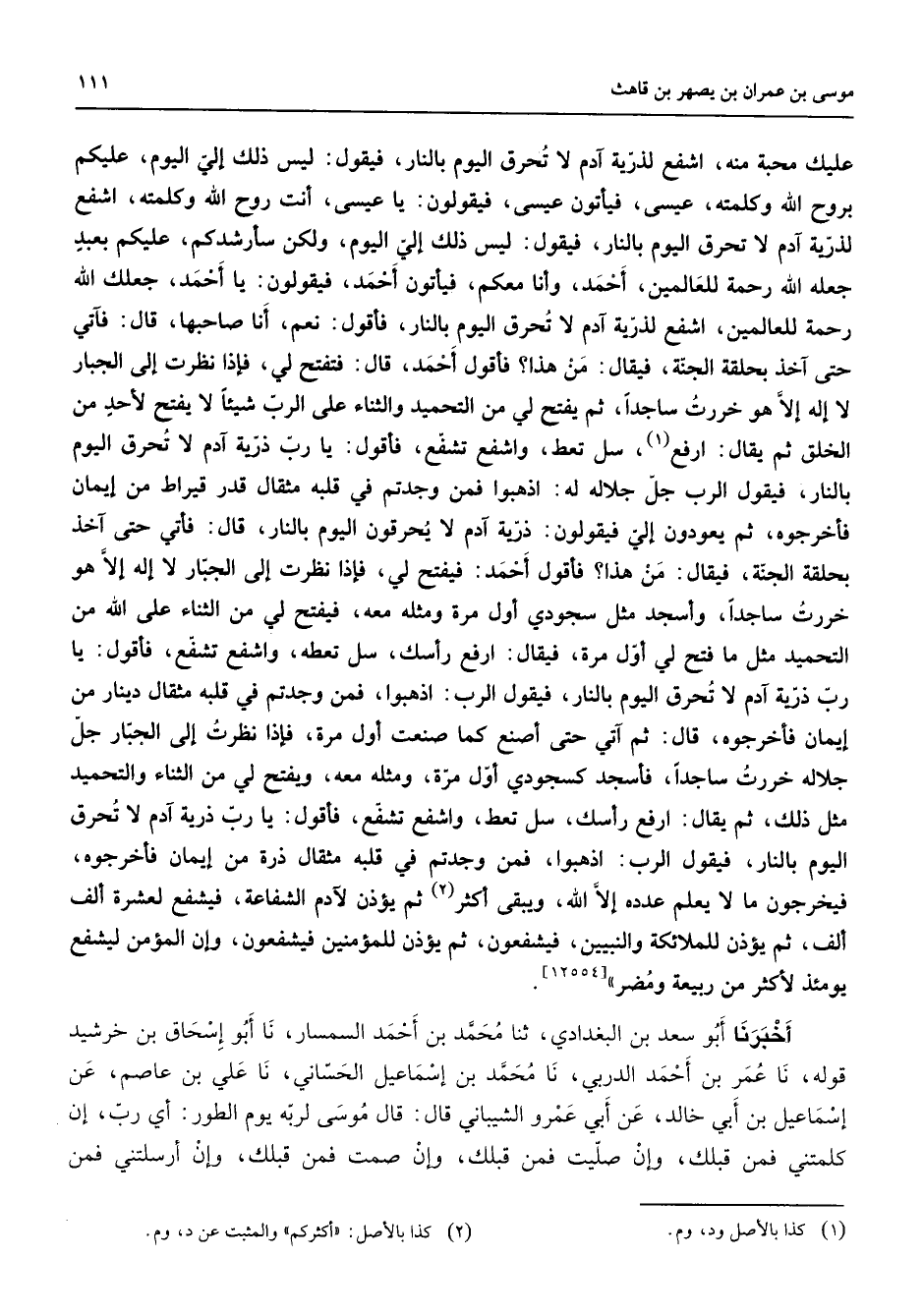 عليك محبة منه اشفع لذرية آدم لا تحرق اليوم بالنار فيقول ليس ذلك إلي اليوم عليكم بروح الله وكلمته عيسى فيأتون عيسى فيقولون يا عيسى أنت روح الله وكلمته اشفع لذرية آدم لا تحرق اليوم بالنار فيقول ليس ذلك إلي اليوم ولكن سأرشدكم عليكم بعبد جعله الله رحمة للعالمين أحمد وأنا معكم فيأتون أحمد فيقولون يا أحمد جعلك الله رحمة للعالمين اشفع لذرية آدم لا تحرق اليوم بالنار فأقول نعم أنا صاحبها قال فآتي حتى آخذ بحلقة الجنة فيقال من هذا فأقول أحمد قال فتفتح لي فإذا نظرت إلى الجبار لا إله إلا هو خررت ساجدا ثم يفتح لي من التحميد والثناء على الرب شيئا لا يفتح لأحد من الخلق ثم يقال ارفع (1) سل تعط واشفع تشفع فأقول يا رب ذرية آدم لا تحرق اليوم بالنار فيقول الرب جل جلاله له اذهبوا فمن وجدتم في قلبه مثقال قدر قيراط من إيمان فأخرجوه ثم يعودون إلي فيقولون ذرية آدم لا يحرقون اليوم بالنار قال فآتي حتى آخذ بحلقة الجنة فيقال من هذا فأقول أحمد فيفتح لي فإذا نظرت إلى الجبار لا إله إلا هو خررت ساجدا ساجدا وأسجد مثل سجودي أول مرة ومثله معه فيفتح لي من الثناء على الله من التحميد مثل ما فتح لي أول مرة فيقال ارفع رأسك سل تعطه واشفع تشفع فأقول يا رب ذرية آدم لا تحرق اليوم بالنار فيقول الرب اذهبوا فمن وجدتم في قلبه مثقال دينار من إيمان فأخرجوه قال ثم آتي حتى أصنع كما صنعت أول مرة فإذا نظرت إلى الجبار جل جلاله خررت ساجدا فأسجد كسجودي أول مرة ومثله معه ويفتح لي من الثناء والتحميد مثل ذلك ثم يقال ارفع رأسك سل تعط واشفع تشفع فأقول يا رب ذرية آدم لا تحرق اليوم بالنار فيقول الرب اذهبوا فمن وجدتم في قلبه مثقال ذرة من إيمان فأخرجوه فيخرجون ما لا يعلم عدده إلا الله ويبقى أكثر (2) ثم يؤذن لآدم الشفاعة فيشفع لعشرة ألف ألف ثم يؤذن للملائكة والنبيين فيشفعون ثم يؤذن للمؤمنين فيشفعون وإن المؤمن ليشفع يومئذ لأكثر من ربيعة ومضر أخبرنا أبو سعد بن البغدادي نا محمد بن أحمد السمسار نا أبو إسحاق بن خرشيد قوله نا عمر بن أحمد الدربي نا محمد بن إسماعيل الحساني نا علي بن عاصم عن إسماعيل بن أبي خالد عن أبي عمرو الشيباني قال قال موسى لربه يوم الطور أي رب إن كلمتني فمن قبلك وإن صليت فمن قبلك وإن صمت فمن قبلك وإن أرسلتني فمن