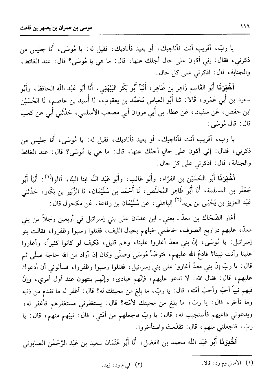 يا رب أقريب أنت فأناجيك أو بعيد فأناديك فقيل له يا موسى أنا جليس من ذكرني فقال إني أكون على حال أجلك عنها قال ما هي يا موسى قال عند الغائط والجنابة قال اذكرني على كل حال أخبرنا أبو القاسم زاهر بن طاهر أنبأ أبو بكر البيهقي أنا أبو عبد الله الحافظ وأبو سعيد بن أبي عمرو قالا ثنا أبو العباس محمد بن يعقوب نا أسيد بن عاصم نا الحسين ابن حفص عن سفيان عن عطاء بن أبي مروان أبي مصعب الأسلمي حدثني أبي عن كعب قال قال موسى يا رب أقريب أنت فأناجيك أو بعيد فأناديك فقيل له يا موسى أنا جليس من ذكرني فقال إني أكون على حال أجلك عنها قال ما هي يا موسى قال عند الغائط والجنابة قال اذكرني على كل حال أخبرنا أبو الحسين بن الفراء وأبو غالب وأبو عبد الله ابنا البنا قالوا (1) أنبأ أبو جعفر بن المسلمة أنا أبو طاهر المخلص نا أحمد بن سليمان نا الزبير بن بكار حدثني عبد العزيز بن يحيى بن يزيد (2) الباهلي عن سليمان بن رفاعة عن مكحول قال أغار الضحاك بن معد يعني ابن عدنان على بني إسرائيل في أربعين رجلا من بني معد عليهم دراريع الصوف خاطمي خيلهم بحبال الليف فقتلوا وسبوا وظفروا فقالت بنو إسرائيل يا موسى إن بني معد أغاروا علينا وهم قليل فكيف لو كانوا كثيرا وأغاروا علينا وأنت نبينا فادع الله عليهم فتوضأ موسى وصلى وكان إذا أراد من الله حاجة صلى ثم قال يا رب إن بني معد أغاروا على بني إسرائيل فقتلوا وسبوا وظفروا فسألوني أن أدعوك عليهم قال فقال الله لا تدعو عليهم فإنهم عبادي وإنهم ينتهون عند أول أمري وإن فيهم نبيا أحبه وأحب أمته قال يا رب ما بلغ من محبتك له قال أغفر له ما تقدم من ذنبه وما تأخر قال يا رب ما بلغ من محبتك لأمته قال يستغفرني مستغفرهم فأغفر له ويدعوني داعيهم فأستجيب له قال يا رب فاجعلهم من أمتي قال نبيهم منهم قال يا رب فاجعلني منهم قال تقدمت واستأخروا أخبرنا أبو عبد الله محمد بن الفضل أنا أبو عثمان سعيد بن عبد الرحمن الصابوني