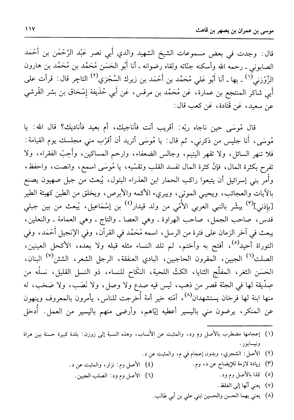 قال وجدت في بعض مسموعات الشيخ الشهيد والدي أبي نصر عبد الرحمن بن أحمد الصابوني رحمه الله وأسكنه جناته ولقاه رضوانه أنا أبو الحسن محمد بن محمد بن هارون الزوزني (1) بها أنا أبو علي محمد بن أحمد بن زيرك السجزي (2) التاجر قال قرأت على أبي شاكر المنتجع بن عمارة عن محمد بن مرقس عن أبي حذيفة إسحاق بن بشر القرشي عن سعيد عن قتادة عن كعب قال قال موسى حين ناجاه ربه أقريب أنت فأناجيك أم بعيد فأناديك قال الله يا موسى أنا جليس من ذكرني ثم قال يا موسى أتريد أن أقرب مني مجلسك يوم القيامة فلا تنهر السائل ولا تقهر اليتيم وجالس الضعفاء وارحم المساكين وأحب الفقراء ولا تفرح بكثرة المال فإن كثرة المال تفسد القلب وتقسيه يا موسى اسمع وانصت واحفظ وأمر بني إسرائيل أن يتبعوا راكب الحمار ابن العذراء البتول يبعث من جبل صهيون يصنع بالآيات والعجائب ويحيي الموتى ويبرئ الأكمه والأبرص ويخلق من الطين كهيئة الطير بإذني (3) يبشر بالنبي العربي الأمي من ولد قيدار (4) بن إسماعيل يبعث من بين جبلي قدس صاحب الجمل صاحب الهراوة وهي العصا والتاج وهي العمامة والنعلين يبعث في آخر الزمان على فترة من الرسل اسمه محمد في القرآن وفي الإنجيل أحمد وفي التوراة أحيد (5) أفتح به وأختم لم تلد النساء مثله قبله ولا بعده الأكحل العينين الصلت (6) الجبين المقرون الحاجبين البادي العنفقة الرجل الشعر الشثن (7) البنان الحسن الثغر المفلج الثنايا الكث اللحية النكاح للنساء ذو النسل القليل نسله من صديقة لها في الجنة قصر من ذهب ليس فيه صدع ولا وصل ولا نصب ولا صخب له منها ابنة لها فرخان يستشهدان (8) أمته خير أمة أخرجت للناس يأمرون بالمعروف وينهون عن المنكر يرضون مني باليسير أعطيه إياهم وأرضى منهم باليسير من العمل أدخل