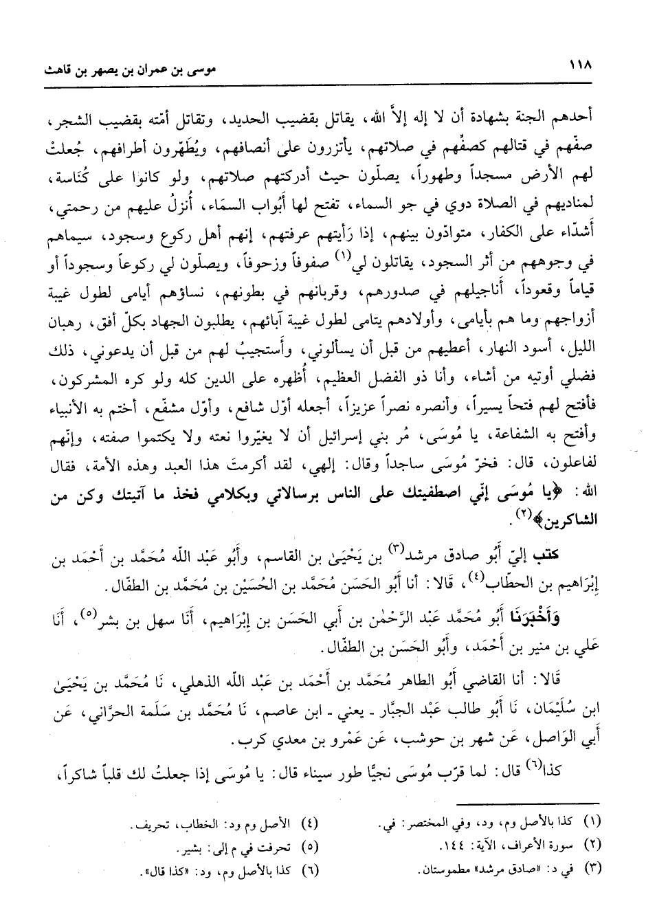 أحدهم الجنة بشهادة أن لا إله إلا الله يقاتل بقضيب الحديد وتقاتل أمته بقضيب الشجر صفهم في قتالهم كصفهم في صلاتهم يأتزرون على أنصافهم ويطهرون أطرافهم جعلت لهم الأرض مسجدا وطهورا يصلون حيث أدركتهم صلاتهم ولو كانوا على كناسة لمناديهم في الصلاة دوي في جو السماء تفتح لهم أبواب السماء أنزل عليهم من رحمتي أشداء على الكفار متوادون بينهم إذا رأيتهم عرفتهم إنهم أهل ركوع وسجود سيماهم في وجوههم من أثر السجود يقاتلون لي (1) صفوفا وزحوفا ويصلون لي ركوعا وسجودا أو قياما وقعودا أناجيلهم في صدورهم وقربانهم في بطونهم نساؤهم أيامى لطول غيبة أزواجهم وما هم بأيامى وأولادهم يتامى لطول غيبة آبائهم يطلبون الجهاد بكل أفق رهبان الليل أسود النهار أعطيهم من قبل أن يسألوني وأستجيب لهم من قبل أن يدعوني ذلك فضلي أوتيه من أشاء وأنا ذو الفضل العظيم أظهره على الدين كله ولو كره المشركون فأفتح لهم فتحا يسيرا وأنصره نصرا عزيزا أجعله أول شافع وأول مشفع أختم به الأنبياء وأفتح به الشفاعة يا موسى مر بني إسرائيل أن لا يغيروا نعته ولا يكتموا صفته وإنهم لفاعلون قال فخر موسى ساجدا وقال إلهي لقد أكرمت هذا العبد وهذه الأمة فقال الله " يا موسى إني اصطفيتك على الناس برسالاتي وبكلامي فخذ ما آتيتك وكن من الشاكرين " (2) كتب إلي أبو صادق مرشد (3) بن يحيى بن القاسم وأبو عبد الله محمد بن أحمد بن إبراهيم بن الحطاب (4) قالا أنا أبو الحسن محمد بن الحسين بن محمد بن الطفال وأخبرنا أبو محمد عبد الرحمن بن أبي الحسن بن إبراهيم أنا سهل بن بشر (5) أنا علي بن منير بن أحمد وأبو الحسن بن الطفال قالا أنا القاضي أبو الطاهر محمد بن أحمد بن عبد الله الذهلي نا محمد بن يحيى ابن سليمان نا أبو طالب عبد الجبار يعني ابن عاصم نا محمد بن سلمة الحراني عن أبي الواصل عن شهر بن حوشب عن عمرو بن معدي كرب كذا (6) قال لما قرب موسى نجيا طور سيناء قال يا موسى إذا جعلت لك قلبا شاكرا