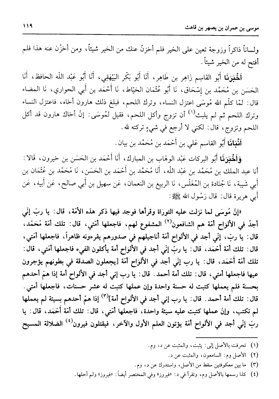 ولسانا ذاكرا وزوجة تعين على الخير فلم أخزن عنك من الخير شيئا ومن أخزن عنه هذا فلم أفتح له من الخير شيئا أخبرنا أبو القاسم زاهر بن طاهر أنا أبو بكر البيهقي أنا أبو عبد الله الحافظ أنا الحسن بن محمد بن إسحاق نا أبو عثمان الخياط نا أحمد بن أبي الحواري نا المضاء قال لما كلم الله موسى اعتزل النساء وترك اللحم فبلغ ذلك هارون أخاه فاعتزل النساء وترك اللحم ثم لم يلبث (1) أن تزوج وأكل اللحم فقيل لموسى إن أخاك هارون قد أكل اللحم وتزوج قال لكني لا أرجع في شئ تركته لله أنبأنا أبو القاسم علي بن أحمد بن محمد بن بيان وأخبرنا أبو البركات عبد الوهاب بن المبارك أنا أحمد بن الحسن بن خيرون قالا أنا عبد الملك بن محمد بن عبد الله أنا محمد بن أحمد بن الحسن نا محمد بن عثمان بن أبي شيبة نا جنادة بن المغلس نا الربيع بن النعمان عن سهيل بن أبي صالح عن أبيه عن أبي هريرة قال قال رسول الله (صلى الله عليه وسلم) إن موسى لما نزلت عليه التوراة وقرأها فوجد فيها ذكر هذه الأمة قال يا رب إني أجد في الألواح أمة هم الشافعون (2) المشفوع لهم فاجعلها أمتي قال تلك أمة محمد قال يا رب إني أجد في الألواح أمة أناجيلهم في صدورهم يقرءونه ظاهرا فاجعلها أمتي قال تلك أمة أحمد قال يا رب إني أجد في الألواح أمة (3) يأكلون الفئ فاجعلها أمتي قال تلك أمة أحمد قال يا رب إني أجد في الألواح أمة يجعلون الصدقة في بطونهم يؤجرون عليها فاجعلها أمتي قال تلك أمة أحمد قال يا رب إني أجد في الألواح أمة إذا هم أحدهم بحسنة فلم يعملها كتبت له حسنة وإن عملها كتبت له عشر حسنات فاجعلها أمتي قال تلك أمة أحمد قال يا رب إني أجد في الألواح أمة إذا هم أحدهم بسيئة لم يعملها لم تكتب وإن عملها كتبت عليه سيئة واحدة فاجعلها أمتي قال تلك أمة أحمد قال يا رب إني أجد في الألواح أمة يؤتون العلم الأول والآخر فيقتلون فيرون (4) الضلالة المسيح
