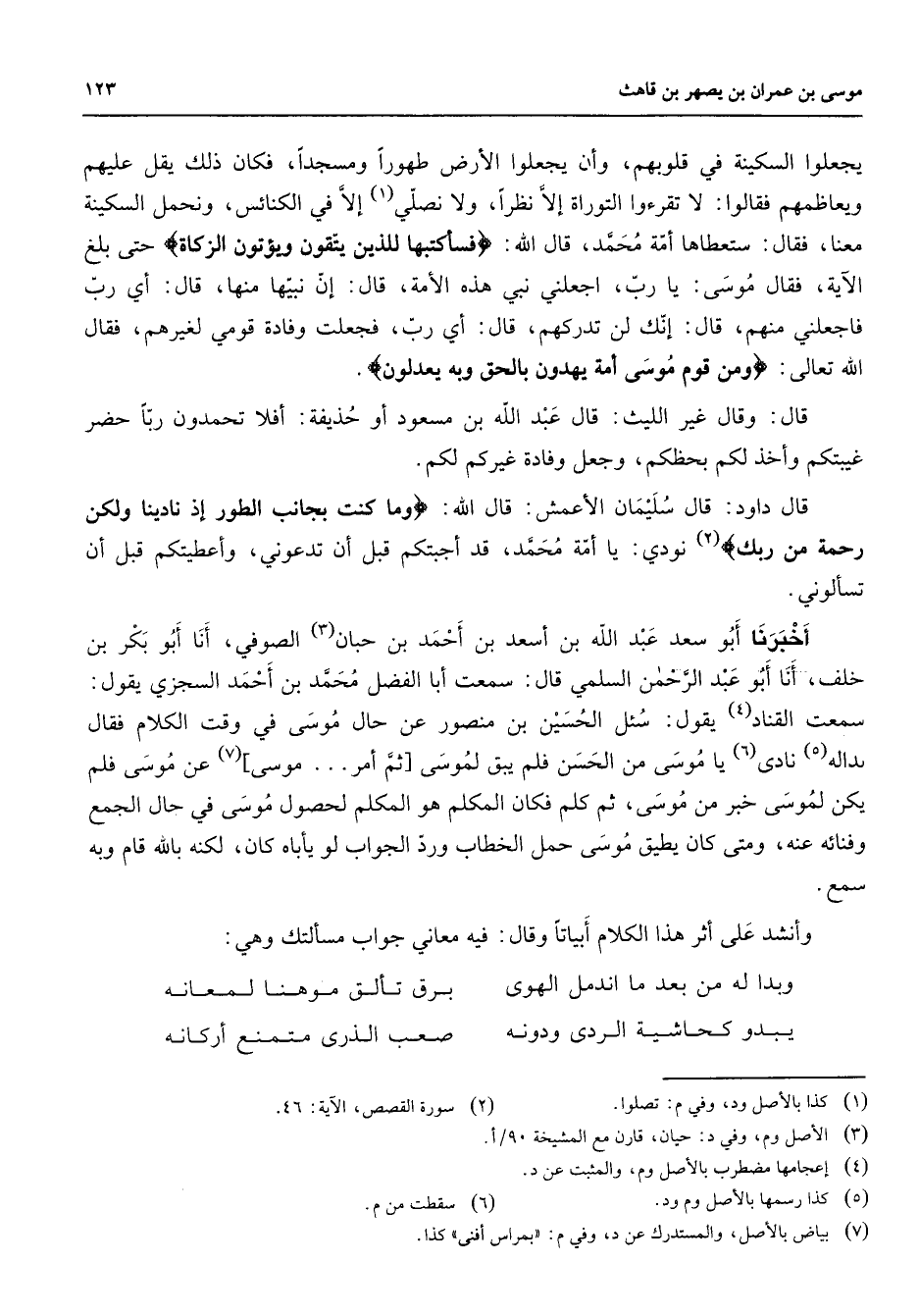 يجعلوا السكينة في قلوبهم وأن يجعلوا الأرض طهورا ومسجدا فكان ذلك يقل عليهم ويعاظمهم فقالوا لا تقرءوا التوراة إلا نظرا ولا نصلي (1) إلا في الكنائس ونحمل السكينة معنا فقال ستعطاها أمة محمد قال الله " فسأكتبها للذين يتقون ويؤتون الزكاة " حتى بلغ الآية فقال موسى يا رب اجعلني نبي هذه الأمة قال إن نبيها منها قال أي رب فاجعلني منهم قال إنك لن تدركهم قال أي رب فجعلت وفادة قومي لغيرهم فقال الله تعالى " ومن قوم موسى أمة يهدون بالحق وبه يعدلون " قال وقال غير الليث قال عبد الله بن مسعود أو حذيفة أفلا تحمدون ربا حضر غيبتكم وأخذ لكم بحظكم وجعل وفادة غيركم لكم قال داود قال سليمان الأعمش قال الله " وما كنت بجانب الطور إذ نادينا ولكن رحمة من ربك " (2) نودي يا أمة محمد قد أجبتكم قبل أن تدعوني وأعطيتكم قبل أن تسألوني أخبرنا أبو سعد عبد الله بن أسعد بن أحمد بن حبان (3) الصوفي أنا أبو بكر بن خلف أنا أبو عبد الرحمن السلمي قال سمعت أبا الفضل محمد بن أحمد السجزي يقول سمعت القناد (4) يقول سئل الحسين بن منصور عن حال موسى في وقت الكلام فقال بداله (5) نادى (6) يا موسى من الحسن فلم يبق لموسى ثم أمر موسى (7) عن موسى فلم يكن لموسى خبر من موسى ثم كلم فكان المكلم هو المكلم لحصول موسى في حال الجمع وفنائه عنه ومتى كان يطيق موسى حمل الخطاب ورد الجواب لو يأباه كان لكنه بالله قام وبه سمع وأنشد على أثر هذا الكلام أبياتا وقال فيه معاني جواب مسألتك وهي * وبدا له من بعد ما اندمل الهوى * برق تألق موهنا لمعانه يبدو كحاشية الردى ودونه * صعب الذرى متمنع أركانه