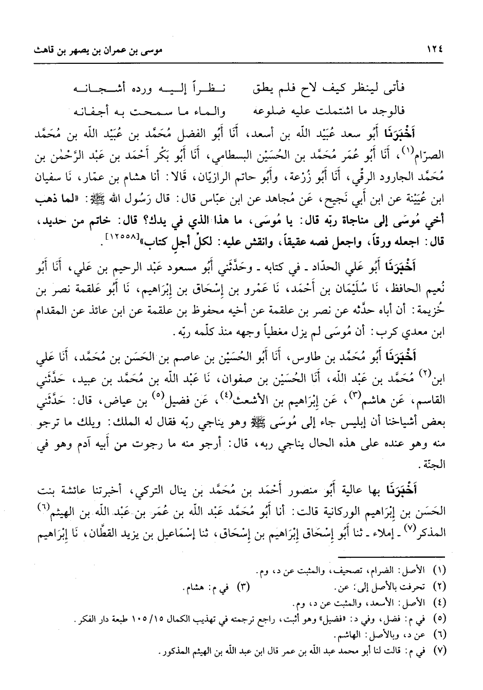 فأتى لينظر كيف لاح فلم يطق * نظرا إليه ورده أشجانه فالوجد ما اشتملت عليه ضلوعه * والماء ما سمحت به أجفانه * أخبرنا أبو سعد عبيد الله بن أسعد أنا أبو الفضل محمد بن عبيد الله بن محمد الصرام (1) أنا أبو عمر محمد بن الحسين البسطامي أنا أبو بكر أحمد بن عبد الرحمن بن محمد الجارود الرقي أنا أبو زرعة وأبو حاتم الرازيان قالا أنا هشام بن عمار نا سفيان ابن عيينة عن ابن أبي نجيح عن مجاهد عن ابن عباس قال قال رسول الله (صلى الله عليه وسلم) لما ذهب أخي موسى إلى مناجاة ربه قال يا موسى ما هذا الذي في يدك قال خاتم من حديد قال اجعله ورقا واجعل فصه عقيقا وانقش عليه لكل أجل كتاب أخبرنا أبو علي الحداد في كتابه وحدثني أبو مسعود عبد الرحيم بن علي أنا أبو نعيم الحافظ نا سليمان بن أحمد نا عمرو بن إسحاق بن إبراهيم نا أبو علقمة نصر بن خزيمة أن اباه حدثه عن نصر بن علقمة عن أخيه محفوظ بن علقمة عن ابن عائذ عن المقدام ابن معدي كرب أن موسى لم يزل مغطيا وجهه منذ كلمه ربه أخبرنا أبو محمد بن طاوس أنا أبو الحسين بن عاصم بن الحسن بن محمد أنا علي ابن (2) محمد ابن عبد الله أنا الحسين بن صفوان نا عبد الله بن محمد بن عبيد حدثني القاسم عن هاشم (3) عن إبراهيم بن الأشعث (4) عن فضيل (5) بن عياض قال حدثني بعض أشياخنا أن إبليس جاء إلى موسى (صلى الله عليه وسلم) وهو يناجي ربه فقال له الملك ويلك ما ترجو منه وهو عنده على هذه الحال يناجي ربه قال أرجو منه ما رجوت من أبيه آدم وهو في الجنة أخبرنا بها عالية أبو منصور أحمد بن محمد بن ينال التركي أخبرتنا عائشة بنت الحسن بن إبراهيم الوركانية قالت أنا أبو محمد عبد الله بن عمر بن عبد الله بن الهيثم (6) المذكر إملاء ثنا أبو إسحاق إبراهيم بن إسحاق ثنا إسماعيل بن يزيد القطان نا إبراهيم