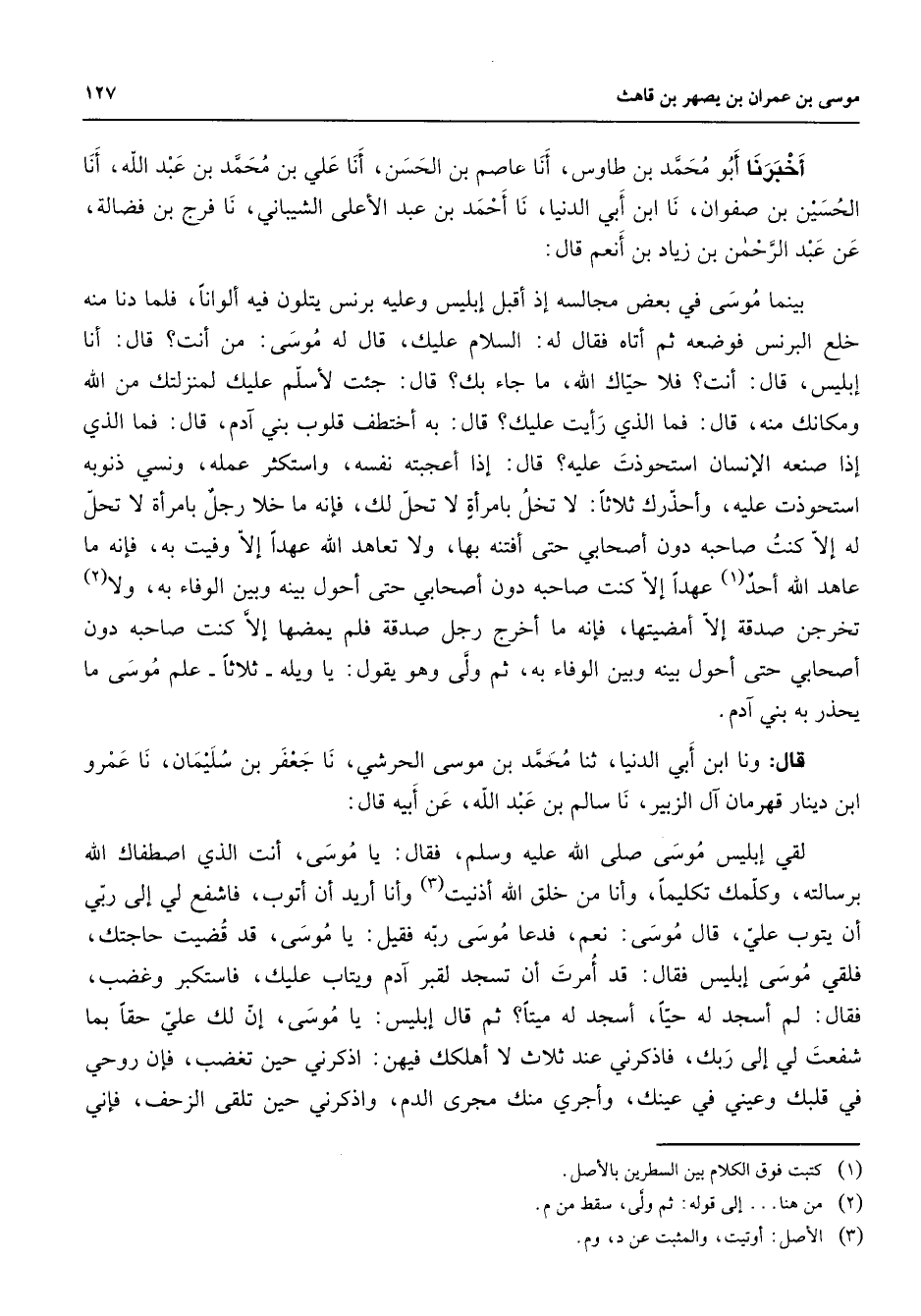 أخبرنا أبو محمد بن طاوس أنا عاصم بن الحسن أنا علي بن محمد بن عبد الله أنا الحسين بن صفوان نا ابن أبي الدنيا نا أحمد بن عبد الأعلى الشيباني نا فرج بن فضالة عن عبد الرحمن بن زياد بن أنعم قال بينما موسى في بعض مجالسه إذ أقبل إبليس وعليه برنس يتلون فيه ألوانا فلما دنا منه خلع البرنس فوضعه ثم أتاه فقال له السلام عليك قال له موسى من أنت قال أنا إبليس قال أنت فلا حياك الله ما جاء بك قال جئت لأسلم عليك لمنزلتك من الله ومكانك منه قال فما الذي رأيت عليك قال به أختطف قلوب بني آدم قال فما الذي إذا صنعه الإنسان استحوذت عليه قال إذا أعجبته نفسه واستكثر عمله ونسي ذنوبه استحوذت عليه وأحذرك ثلاثا لا تخل بامرأة لا تحل لك فإنه ما خلا رجل بامرأة لا تحل له إلا كنت صاحبه دون أصحابي حتى أفتنه بها ولا تعاهد الله عهدا إلا وفيت به فإنه ما عاهد الله أحد (1) عهدا إلا كنت صاحبه دون أصحابي حتى أحول بينه وبين الوفاء به ولا (2) تخرجن صدقة إلا أمضيتها فإنه ما أخرج رجل صدقة فلم يمضها إلا كنت صاحب دون أصحابي حتى أحول بينه وبين الوفاء به ثم ولى وهو يقول يا ويله ثلاثا علم موسى ما يحذر به بني آدم قال ونا ابن أبي الدنيا ثنا محمد بن موسى الحرشي نا جعفر بن سليمان نا عمرو ابن دينار قهرمان آل الزبير نا سالم بن عبد الله عن أبيه قال لقي إبليس موسى (صلى الله عليه وسلم) فقال يا موسى أنت الذي اصطفاك الله برسالته وكلمك تكليما وأنا من خلق الله أذنيت (3) وأنا أريد أن أتوب فاشفع لي إلى ربي أن يتوب علي قال موسى نعم فدعا موسى ربه فقيل يا موسى قد قضيت حاجتك فلقي موسى إبليس فقال قد أمرت أن تسجد لقبر آدم ويتاب عليك فاستكبر وغضب فقال لم أسجد له حيا أسجد له ميتا ثم قال إبليس يا موسى إن لك علي حقا بما شفعت لي إلى ربك فاذكرني عند ثلاث لا أهلكك فيهن اذكرني حين تغضب فإن روحي في قلبك وعيني في عينك وأجري منك مجرى الدم واذكرني حين تلقى الزحف فإني