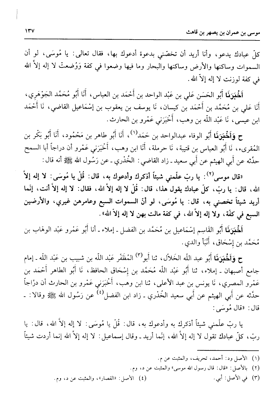 كل عبادك يدعو وأنا أريد أن تخصني بدعوة أدعوك بها فقال تعالى يا موسى لو أن السموات وساكنها والأرض وساكنها والبحار وما فيها وضعوا في كفة ووضعت لا إله إلا الله في كفة لوزنت لا إله إلا الله أخبرنا أبو الحسن علي بن عبد الواحد بن أحمد بن العباس أنا أبو محمد الجوهري أنا علي بن محمد بن أحمد بن كيسان نا يوسف بن يعقوب بن إسماعيل القاضي نا أحمد بن عيسى نا عبد الله بن وهب أخبرني عمرو بن الحارث ح وأخبرنا أبو الوفاء عبد الواحد بن حمد (1) أنا أبو طاهر بن محمود أنا أبو بكر بن المقرئ نا أبو العباس بن قتيبة نا حرملة أنا ابن وهب أخبرني عمرو أن دراجا أبا السمح حدثه عن أبي الهيثم عن ابي سعيد زاد القاضي الخدري عن رسول الله (صلى الله عليه وسلم) أنه قال قال موسى (2) يا ربعلمني شيئا أذكرك وأدعوك به قال قل يا موسى لا إله إلا الله قال يا رب كل عبادك يقول هذا قال قل لا إله إلا الله فقال لا إله إلا أنت إنما اريد شيئا تخصني به قال يا موسى لو أن السموات السبع وعامرهن غيري والأرضين السبع في كفة ولا إله إلا الله في كفة مالت بهن لا إله إلا الله أخبرنا أبو القاسم إسماعيل بن محمد بن الفضل إملاء أنا أبو عمرو عبد الوهاب بن محمد بن إسحاق أنبأ والدي ح وأخبرنا أبو عبد الله الخلال ثنا أبو (3) المظفر عبد الله بن شبيب بن عبد الله إمام جامع أصبهان إملاء ثنا أبو عبد الله محمد بن إسحاق الحافظ نا أبو الطاهر أحمد بن عمرو المصري نا يونس بن عبد الأعلى ثنا ابن وهب أخبرني عمرو بن الحارث أن دراجا حدثه عن أبي الهيثم عن أبي سعيد الخدري زاد ابن الفضل (4) عن رسول الله (صلى الله عليه وسلم) وقالا قال قال موسى يا رب علمني شيئا أذكرك به وأدعوك به قال قل يا موسى لا إله إلا الله قال يا رب كل عبادك تقول لا إله إلا الله إنما أريد وقال إسماعيل لا إله إلا الله إنما أردت شيئا