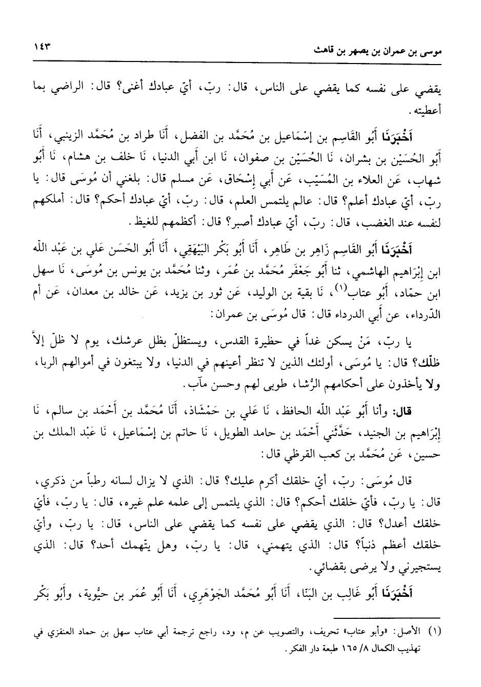يقضي على نفسه كما يقضي على الناس قال رب أي عبادك أغنى قال الراضي بما أعطيته أخبرنا أبو القاسم بن إسماعيل بن محمد بن الفضل أنا طراد بن محمد الزينبي أنا أبو الحسين بن بشران نا الحسين بن صفوان نا ابن ابي الدنيا نا خلف بن هشام نا أبو شهاب عن العلاء بن المسيب عن أبي إسحاق عن مسلم قال بلغني أن موسى قال يا رب أي عبادك أعلم قال عالم يلتمس العلم قال رب أي عبادك أحكم قال أملكهم لنفسه عند الغضب قال رب أي عبادك أصبر قال أكظمهم للغيظ أخبرنا أبو القاسم زاهر بن طاهر أنا أبو بكر البيهقي أنا أبو الحسن علي بن عبد الله ابن إبراهيم الهاشمي ثنا أبو جعفر محمد بن عمر وثنا محمد بن يونس بن موسى نا سهل ابن حماد أبو عتاب (1) نا بقية بن الوليد عن ثور بن يزيد عن خالد بن معدان عن أم الدرداء عن أبي الدرداء قال قال موسى بن عمران يا رب من يسكن غدافي حظيرة القدس ويستظل بظل عرشك يوم لا ظل إلا ظلك قال يا موسى أولئك الذين تنظر أعينهم في الدنيا ولا يبتغون في أموالهم الربا ولا يأخذون على أحكامهم الرشا طوبى لهم وحسن مآب قال وأنا أبو عبد الله الحافظ نا علي بن حمشاذ أنا محمد بن أحمد بن سالم نا إبراهيم بن الجنيد حدثني أحمد بن حامد الطويل نا حاتم بن إسماعيل نا عبد الملك بن حسين عن محمد بن كعب القرظي قال قال موسى رب أي خلقك أكرم عليك قال الذي لا يزال لسانه رطبا من ذكري قال يا رب فأي خلقك أحكم قال الذي يلتمس إلى علمه علم غيره قال يا رب فأي خلقك أعدل قال الذي يقضي على نفسه كما يقضي على الناس قال يا رب وأي خلقك أعظم ذنبا قال الذي يتهمني قال يا رب وهل يتهمك أحد قال الذي يستجيرني ولا يرضى بقضائي أخبرنا أبو غالب بن البنا أنا أبو محمد الجوهري أنا أبو عمر بن حيوية وأبو بكر