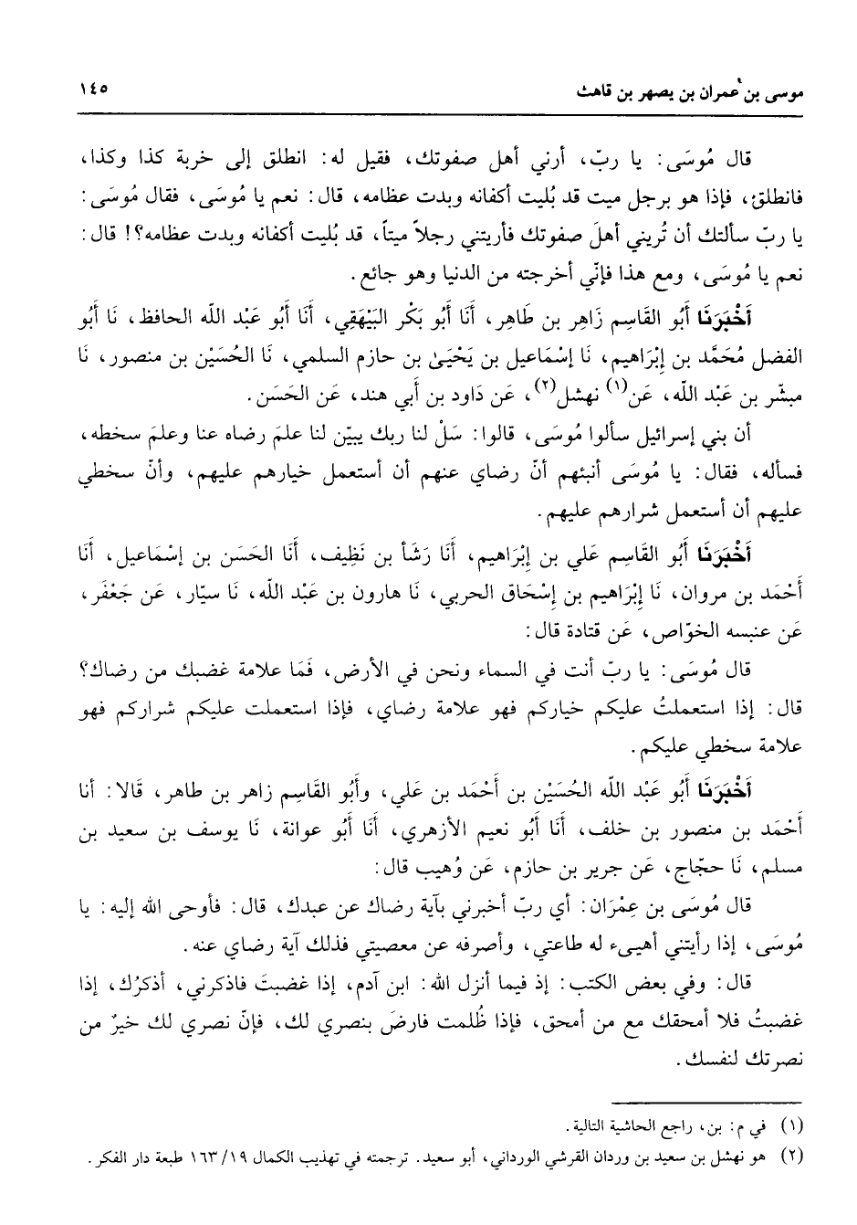 قال موسى يا رب أرني أهل صفوتك فقيل له انطلق إلى خربة كذا وكذا فانطلق فإذا هو برجل ميت قد بليت أكفانه وبدت عظامه قال نعم يا موسى فقال موسى يا رب سألتك أن تريني أهل صفوتك فأريتني رجلا ميتا قد بليت أكفانه وبدت عظامه قال نعم يا موسى ومع هذا فإني أخرجته من الدنيا وهو جائع أخبرنا أبو القاسم زاهر بن طاهر أنا أبو بكر البيهقي أنا أبو عبد الله الحافظ نا أبو الفضل محمد بن إبراهيم نا إسماعيل بن يحيى بن حازم السلمي نا الحسين بن منصور نا مبشر بن عبد الله عن (1) نهشل (2) عن داود بن أبي هند عن الحسن أن بني إسرائيل سألوا موسى قالوا سل لنا ربك يبين لنا علم رضاه عنا وعلم سخطه فسأله فقال يا موسى أنبئهم أن رضاي عنهم أن أستعمل خيارهم عليهم وأن سخطي عليهم أن أستعمل شرارهم عليهم أخبرنا أبو القاسم علي بن إبراهيم أنا رشأ بن نظيف أنا الحسن بن إسماعيل أنا أحمد بن مروان نا إبراهيم بن إسحاق الحربي نا هارون بن عبد الله نا سيار عن جعفر عن عنبسه الخواص عن قتادة قال قال موسى يا رب أنت في السماء ونحن في الأرض فما علامة غضبك من رضاك قال إذا استعملت عليكم خياركم فهو علامة رضاي فإذا استعملت عليكم شراركم فهو علامة سخطي عليكم أخبرنا أبو عبد الله الحسين بن أحمد بن علي وأبو القاسم زاهر بن طاهر قالا أنا أحمد بن منصور بن خلف أنا أبو نعيم الأزهري أنا أبو عوانة نا يوسف بن سعيد بن مسلم نا حجاج عن جرير بن حازم عن وهيب قال قال موسى بن عمران أي رب أخبرني بآية رضاك عن عبدك قال فأوحى الله إليه يا موسى إذا رأيتني أهيئ له طاعتي وأصرفه عن معصيتي فذلك آية رضاي عنه قال وفي بعض الكتب إذ فيما أنزل الله ابن آدم إذا غضبت فاذكرني أذكرك إذا غضبت فلا أمحقك مع من أمحق فإذا ظلمت فارض بنصري لك فإن نصري لك خير من نصرتك لنفسك
