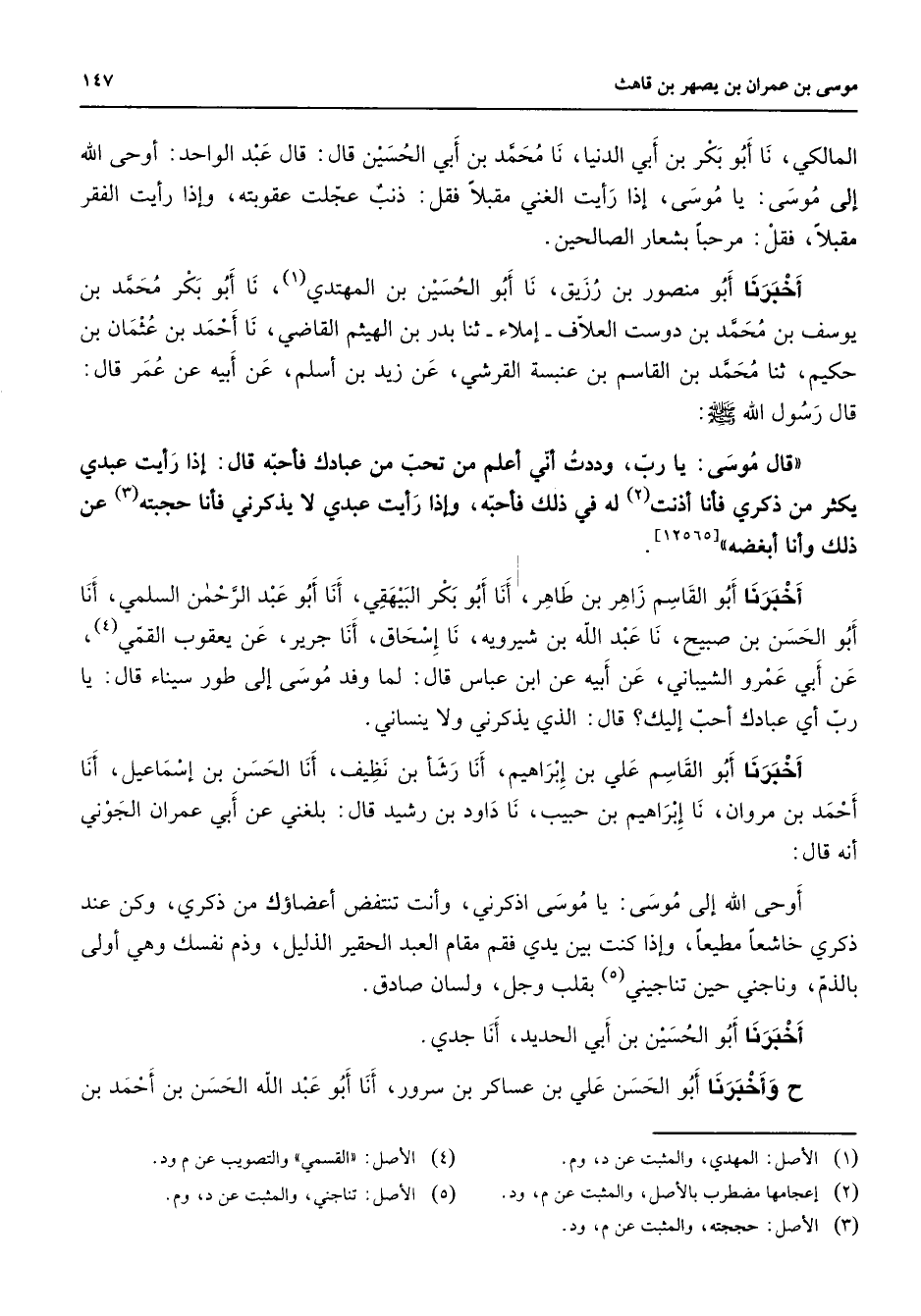 المالكي نا أبو بكر بن أبي الدنيا نا محمد بن أبي الحسين قال قال عبد الواحد أوحى الله إلى موسى يا موسى إذا رأيت الغني مقبلا فقل ذنب عجلت عقوبته وإذا رأيت الفقر مقبلا فقل مرحبا بشعار الصالحين أخبرنا أبو منصور بن رزيق نا أبو الحسين بن المهتدي (1) نا أبو بكر محمد بن يوسف بن محمد بن دوست العلاف إملاء ثنا بدر بن الهيثم القاضي نا أحمد بن عثمان بن حكيم ثنا محمد بن القاسم بن عنبسة القرشي عن زيد بن أسلم عن أبيه عن عمر قال قال رسول الله (صلى الله عليه وسلم) قال موسى يا رب وددت أني أعلم من تحب من عبادك فأحبه قال إذا رأيت عبدي يكثر من ذكري فأنا أذنت (2) له في ذلك فأحبه وإذا رأيت عبدي لا يذكرني فأنا حجبته (3) عن ذلك وأنا أبغضه أخبرنا أبو القاسم زاهر بن طاهر أنا أبو بكر البيهقي أنا أبو عبد الرحمن السلمي أنا أبو الحسن بن صبيح نا عبد الله بن شيرويه نا إسحاق أنا جرير عن يعقوب القمي (4) عن أبي عمرو الشيباني عن أبيه عن ابن عباس قال لما وفد موسى إلى طور سيناء قال يا رب أي عبادك أحب إليك قال الذي يذكرني ولا ينساني أخبرنا أبو القاسم علي بن إبراهيم أنا رشأ بن نظيف أنا الحسن بن إسماعيل أنا أحمد بن مروان نا إبراهيم بن حبيب نا داود بن رشيد قال بلغني عن ابي عمران الجوني أنه قال أوحى الله إلى موسى يا موسى اذكرني وأنت تنتفض أعضاؤك من ذكري وكن عند ذكري خاشعا مطيعا وإذا كنت بين يدي فقم مقام العبد الحقير الذليل وذم نفسك وهي أولى بالذم وناجني حين تناجيني (5) بقلب وجل ولسان صادق أخبرنا أبو الحسين بن أبي الحديد أنا جدي ح وأخبرنا أبو الحسن علي بن عساكر بن سرور أنا أبو عبد الله الحسن بن أحمد بن