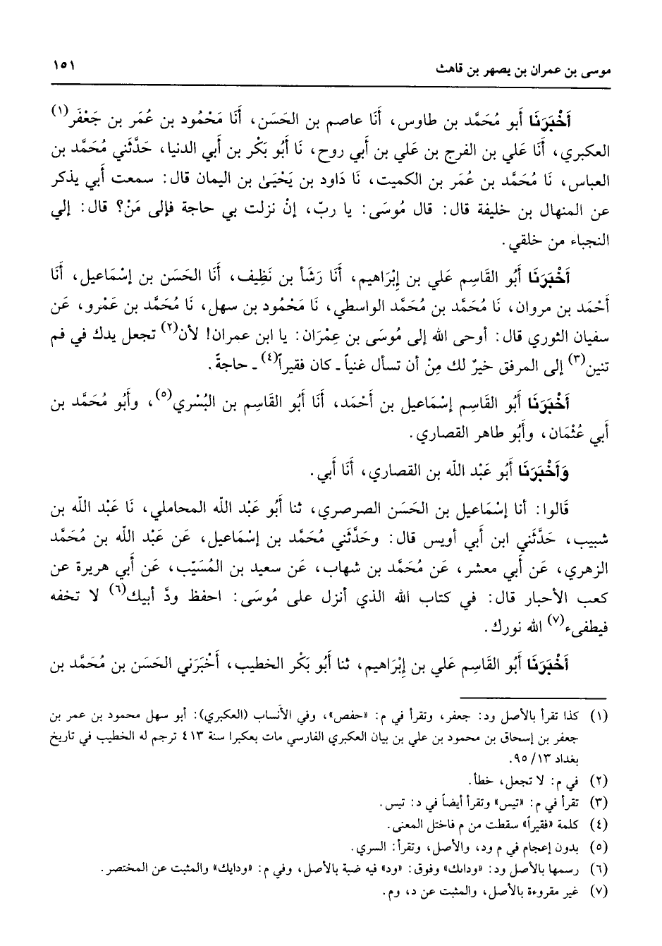 أخبرنا أبو محمد بن طاوس أنا عاصم بن الحسن أنا محمود بن عمر بن جعفر (1) العكبري أنا علي بن الفرج بن علي بن أبي روح نا أبو بكر بن أبي الدنيا حدثني محمد بن العباس نا محمد بن عمر بن الكميت نا داود بن يحيى بن اليمان قال سمعت أبي يذكر عن المنهال بن خليفة قال قال موسى يا رب إن نزلت بي حاجة فإلى من قال إلي النجباء من خلقي أخبرنا أبو القاسم علي بن إبراهيم أنا رشأ بن نظيف أنا الحسن بن إسماعيل أنا أحمد بن مروان نا محمد بن محمد الواسطي نا محمود بن سهل نا محمد بن عمرو عن سفيان الثوري قال أوحى الله إلى موسى بن عمران يا ابن عمران لأن (2) تجعل يدك في فم تنين (3) إلى المرفق خير لك من أن تسأل غنيا كان فقيرا (4) حاجة أخبرنا أبو القاسم إسماعيل بن أحمد أنا أبو القاسم بن البسري (5) وأبو محمد بن أبي عثمان وأبو طاهر القصاري وأخبرنا أبو عبد الله بن القصاري أنا أبي قالوا أنا إسماعيل بن الحسن الصرصري ثنا أبو عبد الله المحاملي نا عبد الله بن شبيب حدثني ابن أبي أويس قال وحدثني محمد بن إسماعيل عن عبد الله بن محمد الزهري عن أبي معشر عن محمد بن شهاب عن سعيد بن المسيب عن أبي هريرة عن كعب الأحبار قال في كتاب الله الذي أنزل على موسى احفظ ود أبيك (6) لا تخفه فيطفئ (7) الله نورك أخبرنا أبو القاسم علي بن إبراهيم ثنا أبو بكر الخطيب أخبرني الحسن بن محمد بن