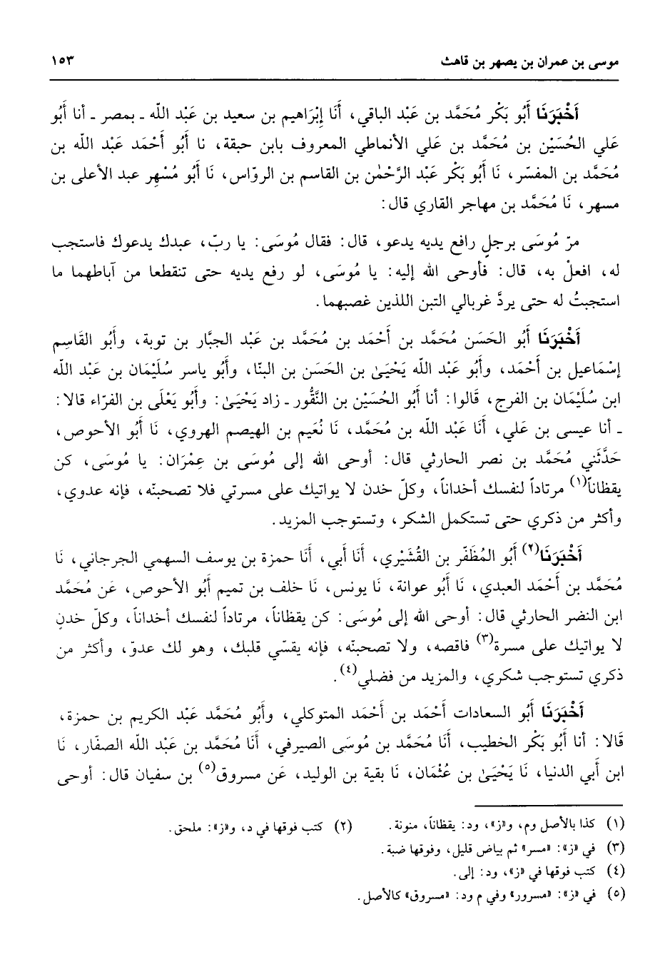 أخبرنا أبو بكر بن عبد الباقي أنا إبراهيم بن سعيد بن عبد الله بمصر أنا أبو علي الحسين بن محمد بن علي الأنماطي المعروف بابن حبقة نا أبو أحمد عبد الله بن محمد بن المفسر نا أبو بكر عبد الرحمن بن القاسم بن الرواس نا أبو مسهر عبد الأعلى بن مسهر نا محمد بن مهاجر القاري قال مر موسى برجل رافع يديه يدعو قال فقال موسى يا رب عبدك يدعوك فاستجب له افعل به قال فأوحى الله إليه يا موسى لو رفع يديه حتى تنقطعا من آباطهما ما استجبت حتى يرد غربالي التبن اللذين غصبهما أخبرنا أبو الحسن محمد بن أحمد بن محمد بن عبد الجبار بن توبة وأبو القاسم إسماعيل بن أحمد وأبو عبد الله يحيى بن الحسن بن البنا وأبو ياسر سليمان بن عبد الله ابن سليمان بن الفرج قالوا أنا أبو الحسين بن النقور زاد يحيى وأبو يعلى بن الفراء قالا أنا عيسى بن علي أنا عبد الله بن محمد نا نعيم بن الهيصم الهروي نا أبو الأحوص حدثني محمد بن نصر الحارثي قال أوحى الله إلى موسى بن عمران يا موسى كن يقظانا (1) مرتادا لنفسك أخدانا وكل خدن لا يواتيك على مسرتي فلا تصحبنه فإنه عدوي وأكثر من ذكري حتى تستكمل الشكر وتستوجب المزيد أخبرنا (2) أبو المظفر بن القشيري أنا أبي أنا حمزة بن يوسف السهمي الجرجاني نا محمد بن أحمد العبدي نا أبو عوانة نا يونس نا خلف بن تميم أبو الأحوص عن محمد ابن النضر الحارثي قال أوحى الله إلى موسى كن يقظانا مرتادا لنفسك أخدانا وكل خدن لا يواتيك على مسرة (3) فاقصه ولا تصحبنه فإنه يقسي قلبك وهو لك عدو وأكثر من ذكري تستوجب شكري والمزيد من فضلي (4) أخبرنا أبو السعادات أحمد بن أحمد المتوكلي وأبو محمد عبد الكريم بن حمزة قالا أنا أبو بكر الخطيب أنا محمد بن موسى الصيرفي أنا محمد بن عبد الله الصفار نا ابن أبي الدنيا نا يحيى بن عثمان نا بقية بن الوليد عن مسروق (5) بن سفيان قال أوحى