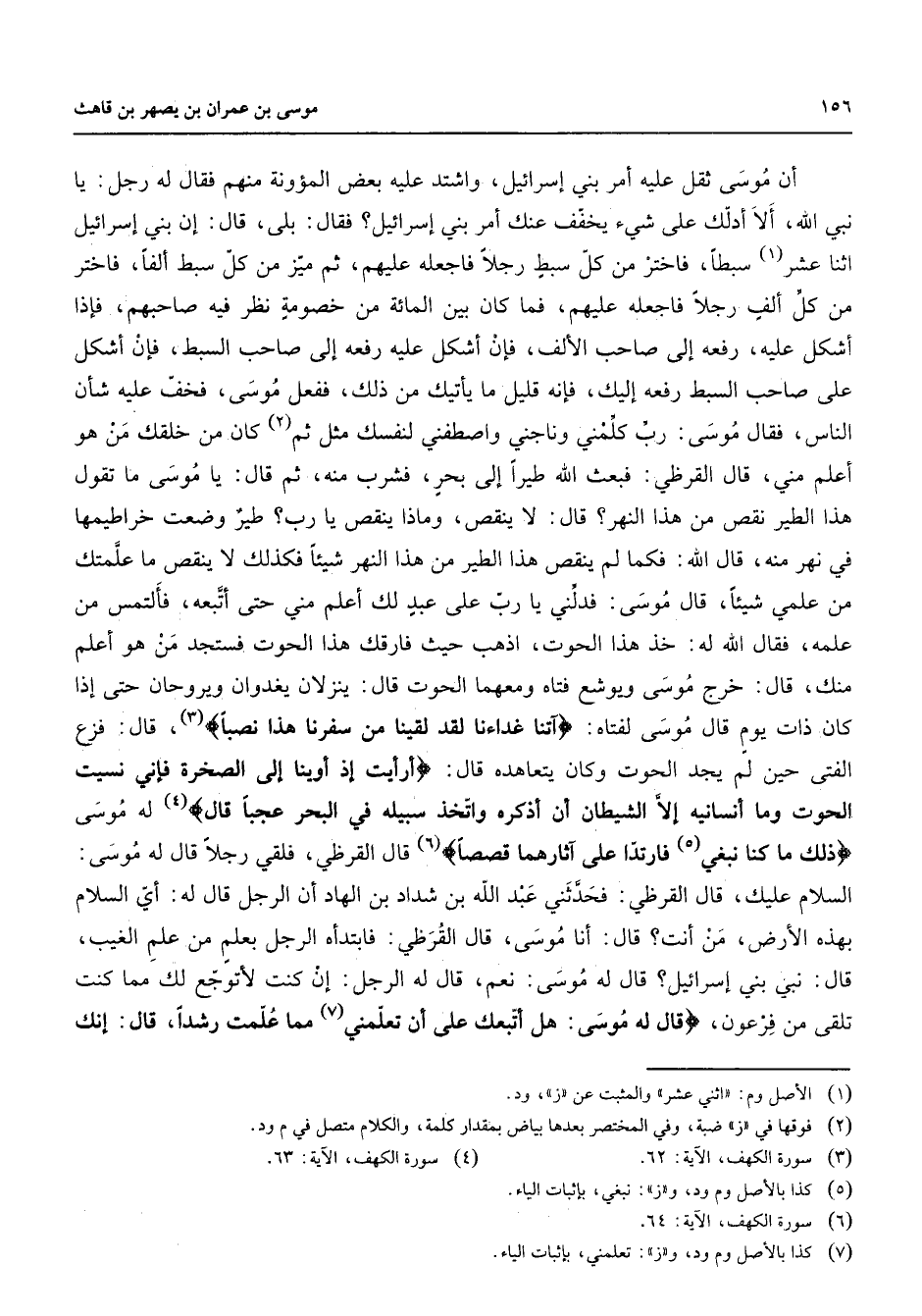 أن موسى ثقل عليه أمر بني إسرائيل واشتد عليه بعض المؤونة منهم فقال له رجل يا نبي الله ألا أدلك على شئ يخفف عنك أمر بني إسرائيل فقال بلى قال إن بني إسرائيل اثنا عشر (1) سبطا فاختر من كل سبط رجلا فاجعله عليهم ثم ميز من كل سبط ألفا فاختر من كل ألف رجلا فاجعله عليهم فما كان بين المائة من خصومه نظر فيه صاحبهم فإذا أشكل عليه رفعه إلى صاحب الألف فإن أشكل عليه رفعه إلى صاحب السبط فإن أشكل على صاحب السبط رفعه إليك فإنه قليل ما يأتيك من ذلك ففعل موسى فخف عليه شأن الناس فقال موسى رب كلمني وناجني واصطفني لنفسك مثل ثم (2) كان من خلقك من هو أعلم مني قال القرظي فبعث الله طيرا إلى بحر فشرب منه ثم قال يا موسى ما تقول هذا الطير نقص من هذا النهر قال لا ينقص وماذا ينقص يا رب طير وضعت خراطيمها في نهر منه قال الله فكما لم ينقص هذا الطير من هذا النهر شيئا فكذلك لا ينقص ما علمتك من علمي شيئا قال موسى فدلني يا رب على عبد لك أعلم مني حتى أتبعه فألتمس من علمه فقال الله له خذ هذا الحوت اذهب حيث فارقك هذا الحوت فستجد من هو أعلم منك قال خرج موسى ويوشع فتاه ومعهما الحوت قال ينزلان يغدوان ويروحان حتى إذا كان ذات يوم قال موسى لفتاه " آتنا غداءنا لقد لقينا من سفرنا هذا نصبا " (3) قال فزع الفتى حين لم يجد الحوت وكان يتعاهده قال " أرأيت إذ أوينا إلى الصخرة فإني نسيت الحوت وما أنسانيه إلا الشيطان أن أذكره واتخذ سبيله في البحر عجبا قال " (4) له موسى " ذلك ما كنا نبغي (5) فارتدا على آثارهما قصصا " (6) قال القرظي فلقي رجلا قال له موسى السلام عليك قال القرظي فحدثني عبد الله بن شداد بن الهاد أن الرجل قال له أي السلام بهذه الأرض من أنت قال أنا موسى قال القرظي فابتدأه الرجل بعلم من علم الغيب قال نبي بني إسرائيل قال له موسى نعم قال له الرجل إن كنت لأتوجع لك مما كنت تلقى من فرعون " قال له موسى هل أتبعك على أن تعلمني (7) مما علمت رشدا قال إنك "