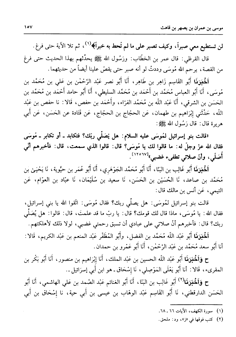 " لن تستطيع معي صبرا وكيف تصبر على ما لم تحط به خبرا " (1) ثم تلا الآية حتى فرغ قال القرظي قال عمر بن الخطاب ورسول الله (صلى الله عليه وسلم) يحدثهم بهذا الحديث حتى فرغ من القصة يرحم الله موسى وددت لو أنه صبر حتى يقص علينا أيضا من حديثهما أخبرنا أبو القاسم زاهر بن طاهر أنا أبو نصر عبد الرحمن بن علي بن محمد بن موسى أنا أبو العباس محمد بن أحمد بن محمد السليطي أنا أبو حامد أحمد بن محمد بن الحسن بن الشرقي أنا عبد الله بن محمد الفراء وأحمد بن حفص قالا نا حفص بن عبد الله حدثني إبراهيم بن طهمان عن الحجاج بن الحجاج عن قتادة عن الحسن عن أبي هريرة قال قال رسول الله (صلى الله عليه وسلم) قالت بنو إسرائيل لموسى عليه السلام هل يصلي ربك فتكابد أو تكابر موسى فقال الله عز وجل له ما قالوا لك يا موسى قال قالوا الذي سمعت قال فأخبرهم أني أصلي وأن صلاتي تطفئ غضبي أخبرنا أبو غالب بن البنا أنا أبو محمد الجوهري أنا أبو عمر بن حيوية نا يحيى بن محمد بن صاعد نا الحسين بن الحسن نا سعيد بن سليمان نا عباد بن العوام عن التيمي عن أنس بن مالك قال قالت بنو إسرائيل لموسى هل يصلي ربك فقال موسى اتقوا الله يا بني إسرائيل فقال الله يا موسى ماذا قال لك قومك قال يا رب ما قد علمت قال قالوا هل يصلي ربك فأخبرهم أن صلاتي على عبادي أن تسبق رحمتي غضبي لولا ذلك لأهلكتهم أخبرنا أبو عبد الله محمد بن الفضل وأبو المظفر عبد المنعم بن عبد الكريم قالا أنا أبو سعد محمد بن عبد الرحمن أنا أبو عمرو بن حمدان ح وأخبرنا أبو عبد الله الحسين بن عبد الملك أنا إبراهيم بن منصور أنا أبو بكر بن المقرئ قالا أنا أبو يعلى الموصلي نا إسحاق هو ابن أبي إسرائيل ح وأخبرنا (2) أبو غالب بن البنا أنا أبو الغنائم عبد الصمد بن علي الهاشمي أنا أبو الحسن الدارقطني نا أبو القاسم عبد الوهاب بن عيسى بن أبي حية نا إسحاق بن أبي