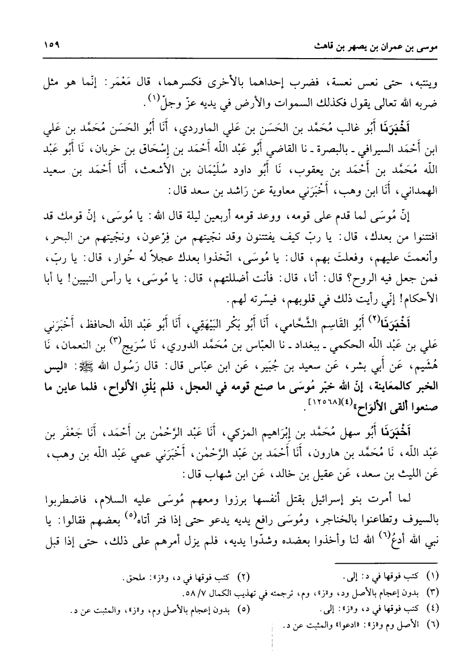 وينتبه حتى نعس نعسة فضرب إحداهما بالأخرى فكسرهما قال معمر إنما هو مثل ضربه الله تعالى يقول فكذلك السماوات والأرض في يديه عز وجل (1) أخبرنا أبو غالب محمد بن الحسن بن علي الماوردي أنا أبو الحسن محمد بن علي ابن أحمد السيرافي بالبصرة نا القاضي أبو عبد الله أحمد بن إسحاق بن خربان نا أبو عبد الله محمد بن أحمد بن يعقوب نا أبو داود سليمان بن الأشعث أنا أحمد بن سعيد الهمداني أنا ابن وهب أخبرني معاوية عن راشد بن سعد قال إن موسى لما قدم على قومه ووعد قومه أربعين ليلة قال الله يا موسى إن قومك قد افتتنوا من بعدك قال يا رب كيف يفتتنون وقد نجيتهم من فرعون ونجيتهم من البحر وأنعمت عليهم وفعلت بهم قال يا موسى اتخذوا بعدك عجلا له خوار قال يا رب فمن جعل فيه الروح قال أنا قال فأنت أضللتهم قال يا موسى يا رأس النبيين يا أبا الأحكام إني رأيت ذلك في قلوبهم فيسرته لهم أخبرنا (2) أبو القاسم الشحامي أنا أبو بكر البيهقي أنا أبو عبد الله الحافظ أخبرني علي بن عبد الله الحكمي ببغداد نا العباس بن محمد الدوري نا سريج (3) بن النعمان نا هشيم عن أبي بشر عن سعيد بن جبير عن ابن عباس قال قال رسول الله (صلى الله عليه وسلم) ليس الخبر كالمعاينة إن الله خبر موسى ما صنع قومه في العجل فلم يلق الألواح فلما عاين ما صنعوا ألقى الألواح (4) أخبرنا أبو سهل محمد بن إبراهيم المزكي أنا عبد الرحمن بن أحمد أنا جعفر بن عبد الله نا محمد بن هارون أنا أحمد بن عبد الرحمن أخبرني عمي عبد الله بن وهب عن الليث بن سعد عن عقيل بن خالد عن ابن شهاب قال لما أمرت بنو إسرائيل بقتل أنفسها برزوا ومعهم موسى عليه السلام فاضطربوا بالسيوف وتطاعنوا بالخناجر وموسى رافع يديه يدعواحتى إذا فتر أتاه (5) بعضهم فقالوا يا نبي الله ادع (6) الله لنا وأخذوا بعضده وشدوا يديه فلم يزل أمرهم على ذلك حتى إذا قبل