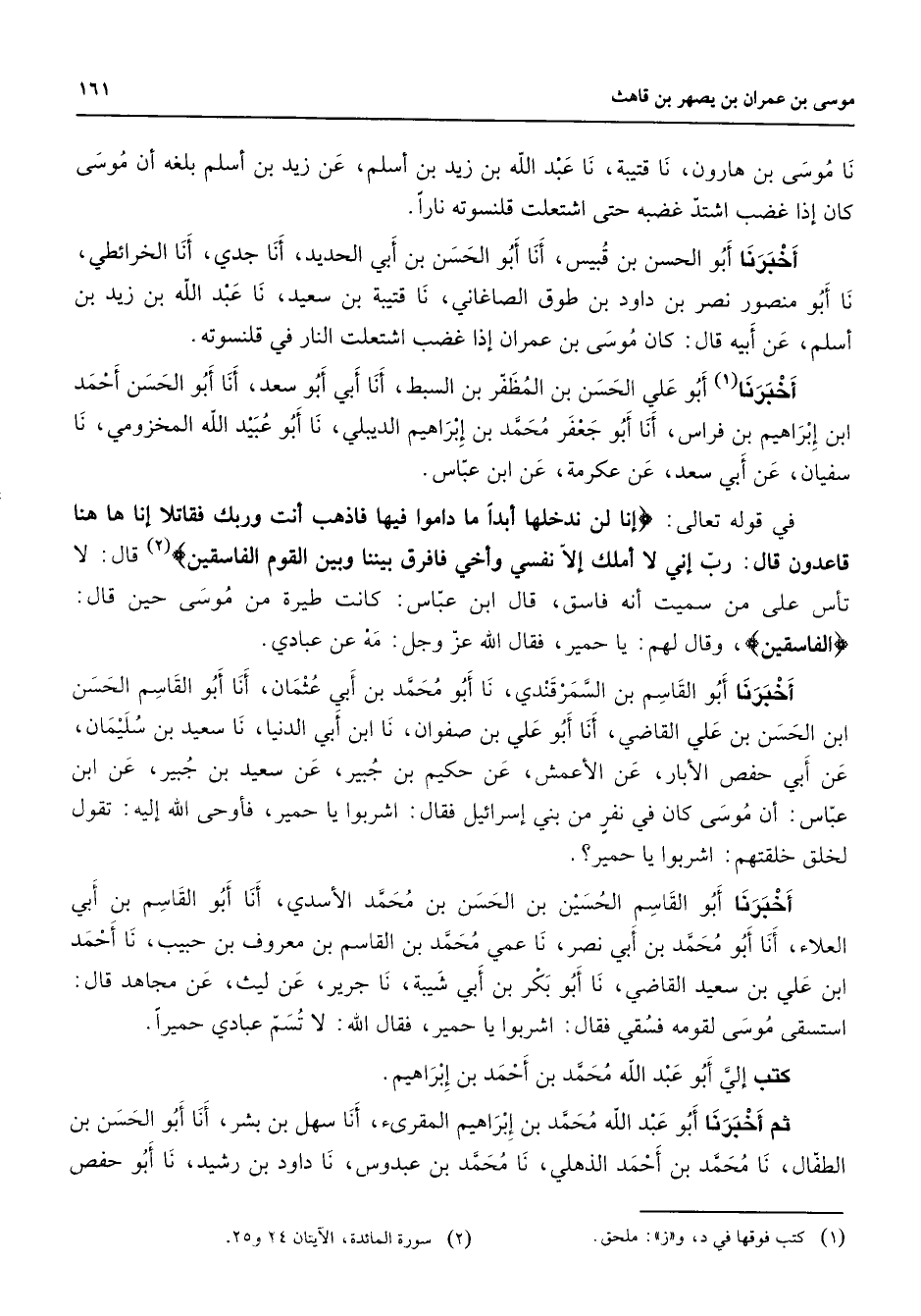 نا موسى بن هارون نا قتيبة نا عبد الله بن زيد بن أسلم عن زيد بن أسلم بلغه أن موسى كان إذا غضب اشتد غضبه حتى اشتعلت قلنسوته نارا أخبرنا أبو الحسن بن قبيس أنا أبو الحسن بن أبي الحديد أنا جدي أنا الخرائطي نا أبو منصور نصر بن داود بن طوق الصاغاني نا قتيبة بن سعيد نا عبد الله بن زيد بن أسلم عن أبيه قال كان موسى بن عمران إذا غضب اشتعلت النار في قلنسوته أخبرنا (1) أبو علي الحسن بن المظفر بن السبط أنا أبي أبو سعد أنا أبو الحسن أحمد ابن إبراهيم بن فراس أنا أبو جعفر محمد بن إبراهيم الديبلي نا أبو عبيد الله المخزومي نا سفيان عن أبي سعد عن عكرمة عن ابن عباس في قوله تعالى " إنا لن ندخلها أبدا ما داموا فيها فاذهب أنت وربك فقاتلا إنا ها هنا قاعدون قال رب إني لا أملك إلا نفسي وأخي فافرق بيننا وبين القوم الفاسقين " (2) قال لا تأس على من سميت أنه فاسق قال ابن عباس كانت طيرة من موسى حين قال " الفاسقين " وقال لهم يا حمير فقال الله عز وجل مه عن عبادي أخبرنا أبو القاسم بن السمرقندي نا أبو محمد بن أبي عثمان أنا أبو القاسم الحسن ابن الحسن بن علي القاضي أنا أبو علي بن صفوان نا ابن أبي الدنيا نا سعيد بن سليمان عن أبي حفص الأبار عن الأعمش عن حكيم بن جبير عن سعيد بن جبير عن ابن عباس أن موسى كان في نفر من بني إسرائيل فقال اشربوا يا حمير فأوحى الله إليه تقول لخلق خلقتهم اشربوا يا حمير أخبرنا أبو القاسم الحسين بن الحسن بن محمد الأسدي أنا أبو القاسم بن أبي العلاء أنا أبو محمد بن أبي نصر نا عمي محمد بن القاسم بن معروف بن حبيب نا أحمد ابن علي بن سعيد القاضي نا أبو بكر بن أبي شيبة نا جرير عن ليث عن مجاهد قال استسقى موسى لقومه فسقي فقال اشربوا يا حمير فقال الله لا تسم عبادي حميرا كتب إلي أبو عبد الله محمد بن أحمد بن إبراهيم ثم أخبرنا أبو عبد الله محمد بن إبراهيم المقرئ أنا سهل بن بشر أنا أبو الحسن بن الطفال نا محمد بن أحمد الذهلي نا محمد بن عبدوس نا داود بن رشيد نا أبو حفص