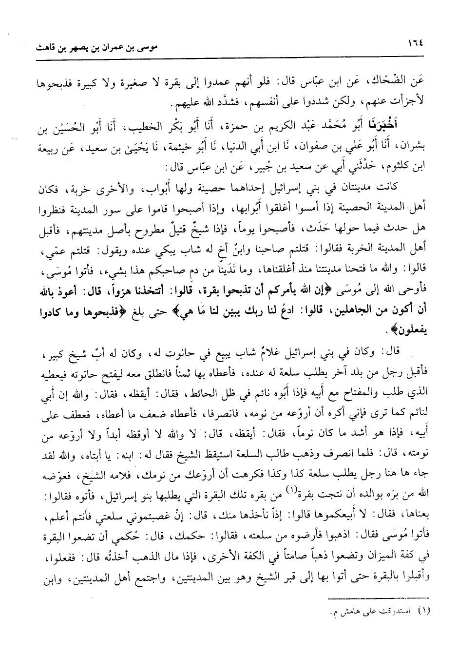 عن الضحاك عن ابن عباس قال فلو أنهم عمدوا إلى بقرة لا صغيرة ولا كبيرة فذبحوها لأجزأت عنهم ولكن شددوا على أنفسهم فشدد الله عليهم أخبرنا أبو محمد عبد الكريم بن حمزة أنا أبو بكر الخطيب أنا أبو الحسين بن بشران أنا أبو علي بن صفوان نا ابن أبي الدنيا نا أبو خيثمة نا يحيى بن سعيد عن ربيعة ابن كلثوم حدثني أبي عن سعيد بن جبير عن ابن عباس قال كانت مدينتان في بني إسرائيل إحداهما حصينة ولها أبواب والأخرى خربة فكان أهل المدينة الحصينة إذا أمسوا أغلقوا أبوابها وإذا أصبحوا قاموا على سور المدينة فنظروا هل حدث فيما حولها حدث فأصبحوا يوما فإذا شيخ قتيل مطروح بأصل مدينتهم فأقبل أهل المدينة الخربة فقالوا قتلتم صاحبنا وابن أخ له شاب يبكي عنده ويقول قتلتم عمي قالوا والله ما فتحنا مدينتنا منذ أغلقناها وما ندينا من دم صاحبكم هذا بشئ فأتوا موسى فأوحى الله إلى موسى " إن الله يأمركم أن تذبحوا بقرة قالوا أتتخذنا هزوا قال أعوذ بالله أن أكون من الجاهلين قالوا ادع لنا ربك يبين لنا ما هي " حتى بلغ " فذبحوها وما كادوا يفعلون " قال وكان في بني إسرائيل غلام شاب يبيع في حانوت له وكان له أب شيخ كبير فأقبل رجل من بلد آخر يطلب سلعة له عنده فأعطاه بها ثمنا فانطلق معه ليفتح حانوته فيعطيه الذي طلب والمفتاح مع أبيه فإذا أبوه نائم في ظل الحائط فقال أيقظه فقال والله إن أبي لنائم كما ترى فإني أكره أن أروعه من نومه فانصرفا فأعطاه ضعف ما أعطاه فعطف على أبيه فإذا هو أشد ما كان نوما فقال أيقظه قال لا والله لا أوقظه أبدا ولا أروعه من نومته قال فلما انصرف وذهب طالب السعة استيقظ الشيخ فقال له ابنه يا أبتاه والله لقد جاء ها هنا رجل يطلب سلعة كذا وكذا فكرهت أن أروعك من نومك فلامه الشيخ فعوضه الله من بره بوالده أن نتجت بقرة (1) من بقرة تلك البقرة التي يطلبها بنو إسرائيل فأتوه فقالوا بعناها فقال لا أبيعكموها قالوا إذا نأخذها منك قال إن غصبتموني سلعتي فأنتم أعلم فأتوا موسى فقال اذهبوا فأرضوه من سلعته فقالوا حكمك قال حكمي أن تضعوا البقرة في كفة الميزان وتضعوا ذهبا صامتا في الكفة الأخرى فإذا مال الذهب أخذته قال ففعلوا وأقبلوا بالبقرة حتى أتوا بها إلى قبر الشيخ وهو بين المدينتين واجتمع أهل المدينتين وابن