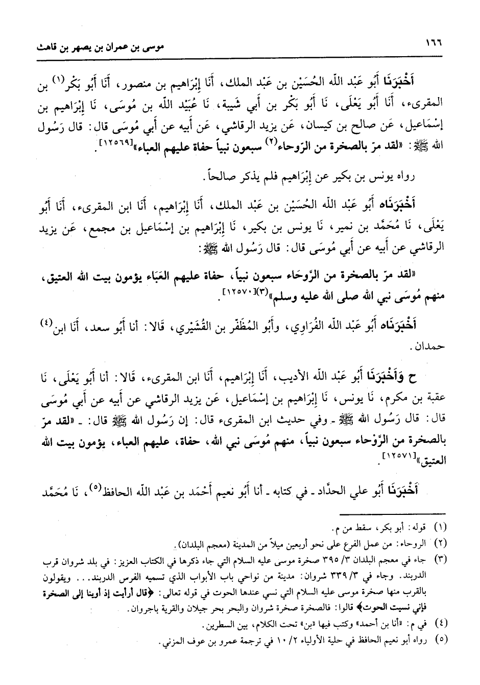أخبرنا أبو عبد الله الحسين بن عبد الملك أنا إبراهيم بن منصور أنا أبو بكر (1) بن المقرئ أنا أبو يعلى نا أبو بكر بن أبي شيبة نا عبيد الله بن موسى نا إبراهيم بن إسماعيل عن صالح بن كيسان عن يزيد الرقاشي عن أبيه عن أبي موسى قال قال رسول الله (صلى الله عليه وسلم) لقد مر بالصخرة من الروحاء (2) سبعون نبيا حفاة عليهم العباء رواه يونس بن بكير عن إبراهيم فلم يذكر صالحا أخبرناه أبو عبد الله الحسين بن عبد الملك أنا إبراهيم أنا ابن المقرئ أنا أبو يعلى نا محمد بن نمير نا يونس بن بكير نا إبراهيم بن إسماعيل بن مجمع عن يزيد الرقاشي عن أبيه عن أبي موسى قال قال رسول الله (صلى الله عليه وسلم) لقد مر بالصخرة من الروحاء سبعون نبيا حفاة عليهم العباء يؤمون بيت الله العتيق منهم موسى نبي الله (صلى الله عليه وسلم) (3) أخبرناه أبو عبد الله الفراوي وأبو المظفر بن القشيري قالا أنا أبو أسعد أنا ابن (4) حمدان ح وأخبرنا أبو عبد الله الأديب أنا إبراهيم أنا ابن المقرئ قالا أنا أبو يعلى نا عقبة بن مكرم نا يونس نا إبراهيم بن إسماعيل عن يزيد الرقاشي عن أبيه عن أبي موسى قال قال رسول الله (صلى الله عليه وسلم) وفي حديث ابن المقرئ قال إن رسول الله (صلى الله عليه وسلم) قال لقد مر بالصخرة من الروحاء سبعون نبيا منهم موسى نبي الله حفاة عليهم العباء يؤمون بيت الله العتيق أخبرنا أبو علي الحداد في كتابه أنا أبو نعيم أحمد بن عبد الله الحافظ (5) نا محمد