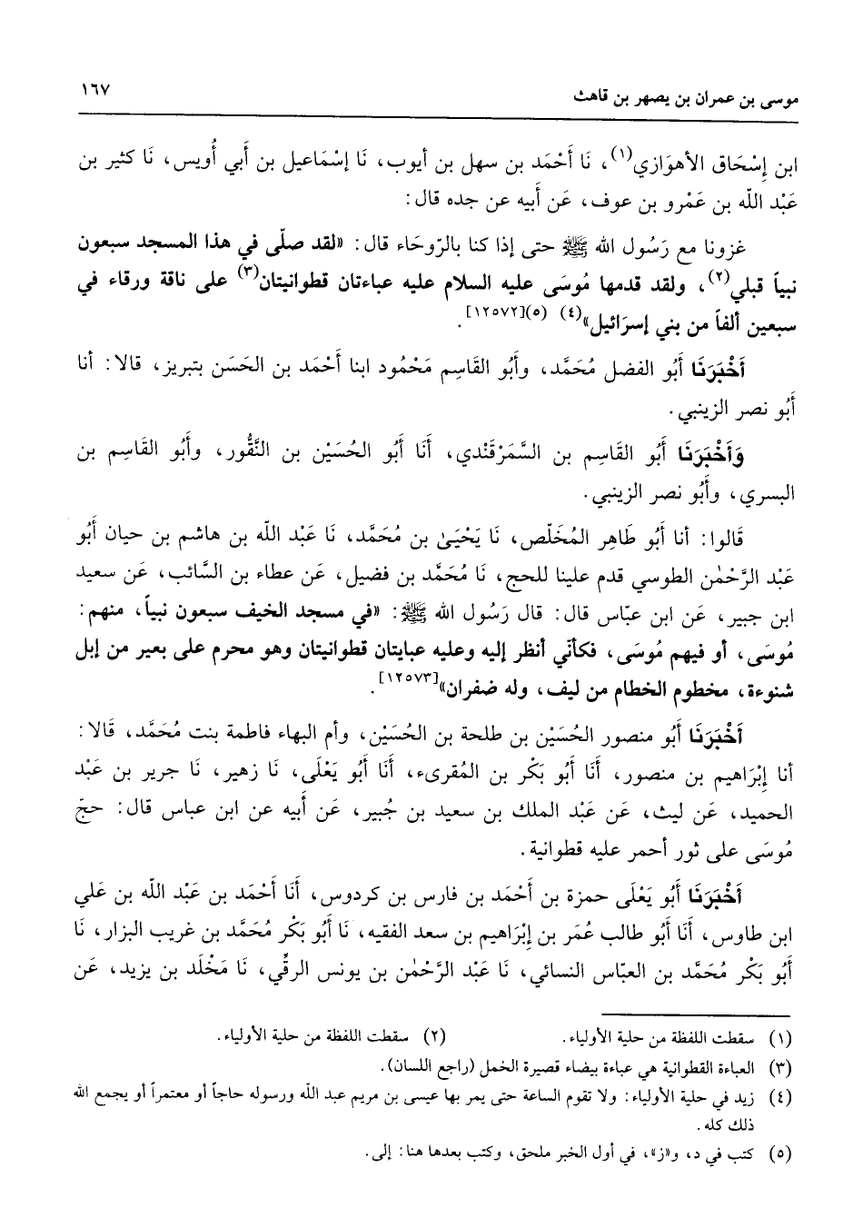 ابن إسحاق الأهوازي (1) نا أحمد بن سهل بن أيوب نا إسماعيل بن أبي أويس نا كثير بن عبد الله بن عمرو بن عوف عن أبيه عن جده قال غزونا مع رسول الله (صلى الله عليه وسلم) حتى إذا كنا بالروحاء قال لقد صلى في هذا المسجد سبعون نبيا قبلي (2) ولقد قدمها موسى عليه السلام عليه عباءتان قطوانيتان (3) على ناقة ورقاء في سبعين ألفا من بني إسرائيل (4) (5) أخبرنا أبو الفضل محمد وأبو القاسم محمود ابنا أحمد بن الحسن بتبريز قالا أنا أبو نصر الزينبي وأخبرنا أبو القاسم بن السمرقندي أنا أبو الحسين بن النقور وأبو القاسم بن البسري وأبو نصر الزينبي قالوا أنا أبو طاهر المخلص نا يحيى بن محمد نا عبد الله بن هاشم بن حيان أبو عبد الرحمن الطوسي قدم علينا للحج نا محمد بن فضيل عن عطاء بن السائب عن سعيد ابن جبير عن ابن عباس قال قال رسول الله (صلى الله عليه وسلم) في مسجد الخيف سبعون نبيا منهم موسى أو فيهم موسى فكأني أنظر إليه وعليه عبايتان قطوانيتان وهو محرم على بعير من إبل شنوءة مخطوم الخطام من ليف وله ضفران أخبرنا أبو منصور الحسين بن طلحة بن الحسين وأم البهاء فاطمة بنت محمد قالا أنا إبراهيم بن منصور أنا أبو بكر بن المقرئ أنا أبو يعلى نا زهير نا جرير بن عبد الحميد عن ليث عن عبد الملك بن سعيد بن جبير عن أبيه عن ابن عباس قال حج موسى على ثور أحمر عليه قطوانية أخبرنا أبو يعلى حمزة بن أحمد بن فارس بن كردوس أنا أحمد بن عبد الله بن علي ابن طاوس أنا أبو طالب عمر بن إبراهيم بن سعد الفقيه نا أبو بكر محمد بن غريب البزار نا أبو بكر محمد بن العباس النسائي نا عبد الرحمن بن يونس الرقي نا مخلد بن يزيد عن
