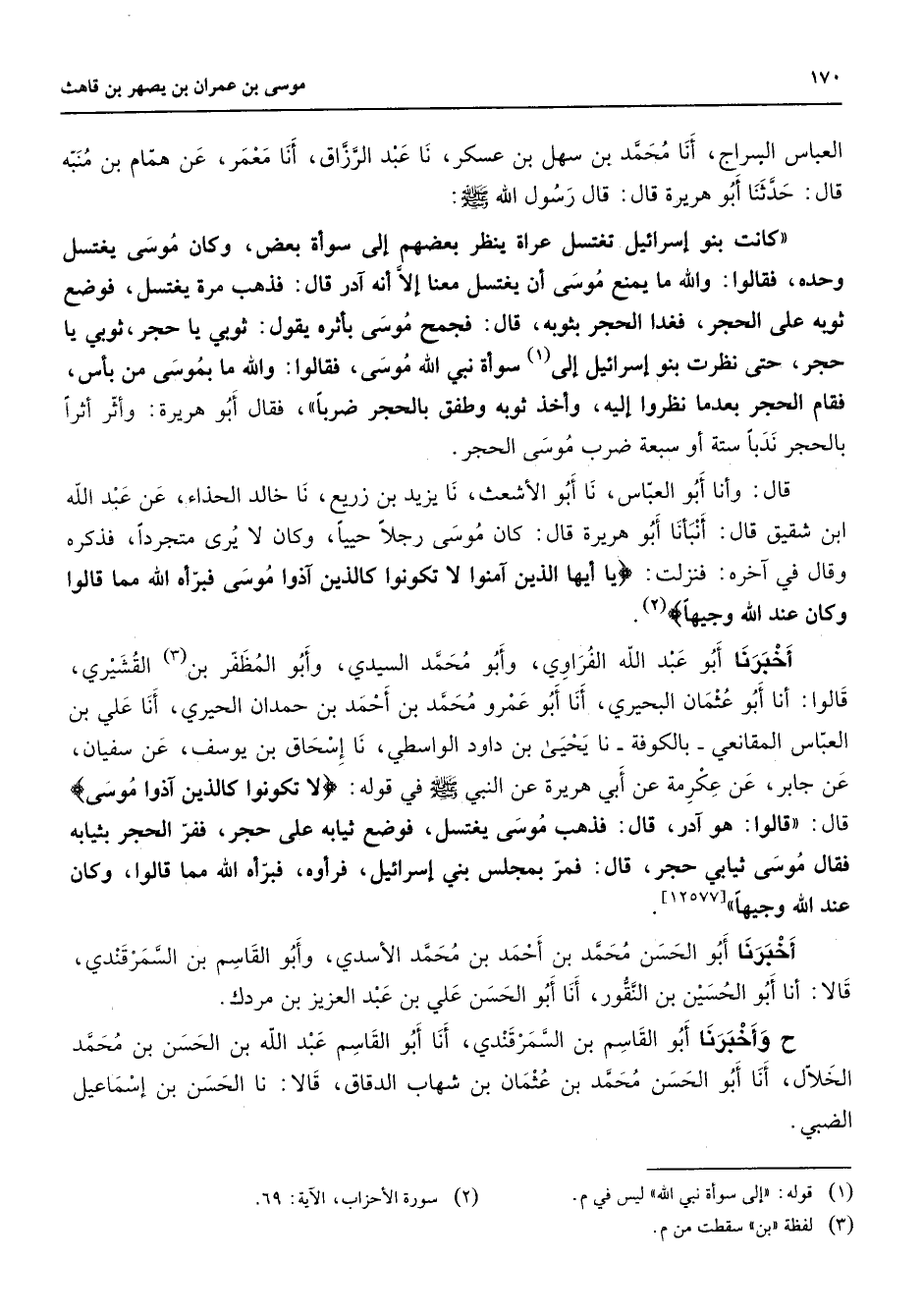 العباس السراج أنا محمد بن سهل بن عسكر نا عبد الرزاق أنا معمر عن همام بن منبه قال حدثنا أبو هريرة قال قال رسول الله (صلى الله عليه وسلم) كانت بنو إسرائيل تغتسل عراة ينظر بعضهم إلى سوأة بعض وكان موسى يغتسل وحده فقالوا والله ما يمنع موسى أن يغتسل معنا إلا أنه آدر قال فذهب مرة يغتسل فوضع ثوبه على الحجر فغدا الحجر بثوبه قال فجمع موسى بأثره يقول ثوبي يا حجر ثوبي يا حجر حتى نظرت بنو إسرائيل إلى (1) سوأة نبي الله موسى فقالوا والله ما بموسى من بأس فقام الحجر بعدما نظروا إليه وأخذ ثوبه وطفق بالحجر ضربا فقال أبو هريرة وأثر أثرا بالحجر ندبا ستة أو سبعة ضرب موسى الحجر قال وأنا أبو العباس نا أبو الأشعث نا يزيد بن زريع نا خالد الحذاء عن عبد الله ابن شقيق قال أنبأنا أبو هريرة قال كان موسى رجلا حييا وكان لا يرى متجردا فذكره وقال في آخره فنزلت " يا أيها الذين آمنوا لا تكونوا كالذين آذوا موسى فبرأه الله مما قالوا وكان عند الله وجيها " (2) أخبرنا أبو عبد الله الفراوي وأبو محمد السيدي وأبو المظفر بن (3) القشيري قالوا أنا أبو عثمان البحيري أنا أبو عمرو محمد بن أحمد بن حمدان الحيري أنا علي بن العباس المقانعي بالكوفة نا يحيى بن داود الواسطي نا إسحاق بن يوسف عن سفيان عن جابر عن عكرمة عن أبي هريرة عن النبي (صلى الله عليه وسلم) في قوله " لا تكونوا كالذين آذوا موسى " قال قالوا هو آدر قال فذهب موسى يغتسل فوضع ثيابه على حجر ففر الحجر بثيابه فقال موسى ثيابي حجر قال فمر بمجلس بني إسرائيل فرأوه فبرأه الله مما قالوا وكان عند الله وجيها أخبرنا أبو الحسن محمد بن أحمد بن محمد الأسدي وأبو القاسم بن السمرقندي قالا أنا أبو الحسين بن النقور أنا أبو الحسن علي بن عبد العزيز بن مردك ح وأخبرنا أبو القاسم بن السمرقندي أنا أبو القاسم عبد الله بن الحسن بن محمد الخلال أنا أبو الحسن محمد بن عثمان بن شهاب الدقاق قالا نا الحسن بن إسماعيل الضبي