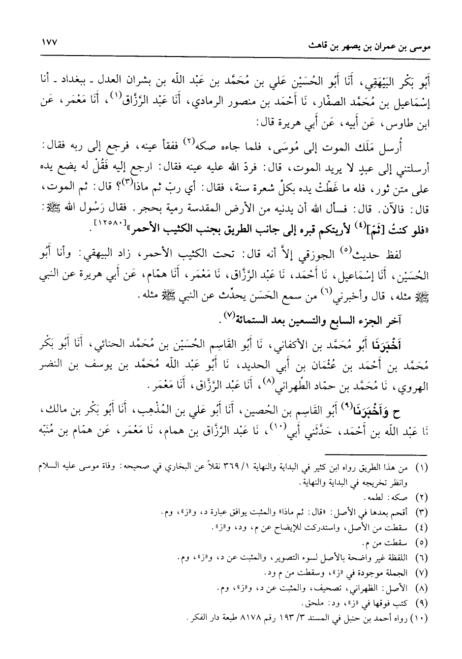 أبو بكر البيهقي أنا أبو الحسين علي بن محمد بن عبد الله بن بشران العدل ببغداد أنا إسماعيل بن محمد الصفار نا أحمد بن منصور الرمادي أنا عبد الرزاق (1) أنا معمر عن ابن طاوس عن أبيه عن أبي هريرة قال أرسل ملك الموت إلى موسى فلما جاءه صكه (2) ففقأ عينه فرجع إلى ربه فقال أرسلتني إلى عبد لا يريد الموت قال فرد الله عليه عينه فقال ارجع إليه فقل له يضع يده على متن ثور فله ما غطت يده بكل شعرة سنة فقال أي رب ثم ماذا (3) قال ثم الموت قال فالآن قال فسأل الله أن يدنيه من الأرض المقدسة رمية بحجر فقال رسول الله (صلى الله عليه وسلم) فلو كنت ثم (4) لأريتكم قبره إلى جانب الطريق بجنب الكثيب الأحمر لفظ حديث (5) الجوزقي إلا أنه قال تحت الكثيب الأحمر زاد البيهقي وأنا أبو الحسين أنا إسماعيل أنا أحمد نا عبد الرزاق نا معمر أنا همام عن أبي هريرة عن النبي (صلى الله عليه وسلم) مثله قال وأخبرني (6) من سمع الحسن يحدث عن النبي (صلى الله عليه وسلم) مثله آخر الجزء السابع والتسعين بعد الستمائة (7) أخبرنا أبو محمد بن الأكفاني نا أبو القاسم الحسين بن محمد الحنائي أنا أبو بكر محمد بن أحمد بن عثمان بن أبي الحديد نا أبو عبد الله محمد بن يوسف بن النضر الهروي نا محمد بن حماد الطهراني (8) أنا عبد الرزاق أنا معمر ح وأخبرنا (9) أبو القاسم بن الحصين أنا أبو علي بن المذهب أنا أبو بكر بن مالك نا عبد الله بن أحمد حدثني أبي (10) نا عبد الرزاق بن همام نا معمر عن همام بن منبه