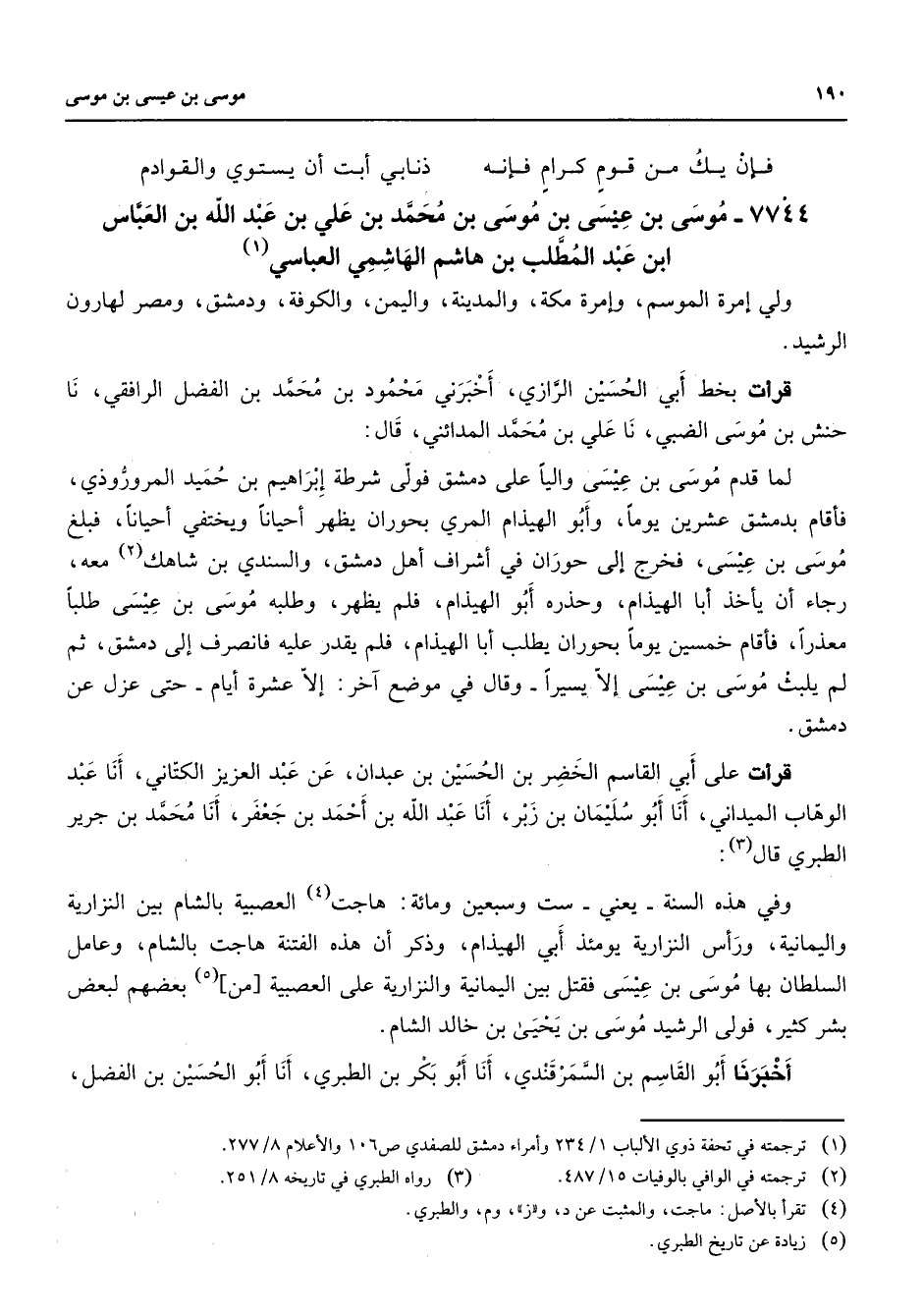 7744 - موسى بن عيسى بن موسى بن محمد بن علي بن عبد الله بن العباس ابن عبد المطلب بن هاشم الهاشمي العباسي (1) ولي إمرة الموسم وإمرة مكة والمدينة واليمن والكوفة ودمشق ومصر لهارون الرشيد قرأت بخط أبي الحسين الرازي أخبرني محمود بن محمد بن الفضل الرافقي نا حنش بن موسى الضبي نا علي بن محمد المدائني قال لما قدم موسى بن عيسى واليا على دمشق فولى شرطة إبراهيم بن حميد المروروذي فأقام بدمشق عشرين يوما وأبو الهيذام المري بحوران يظهر أحيانا ويختفي أحيانا فبلغ موسى بن عيسى فخرج إلى حوران في اشراف أهل دمشق والسندي بن شاهك (2) معه رجاء أن يأخذ أبا الهيذام وحذره أبو الهيذام فلم يظهر وطلبه موسى بن عيسى طلبا معذرا فأقام خمسين يوما بحوران يطلب أبا الهيذام فلم يقدر عليه فانصرف إلى دمشق ثم لم يلبث موسى بن عيسى إلا يسيرا وقال في موضع آخر إلا عشرة أيام حتى عزل عن دمشق قرأت على أبي القاسم الخضر بن الحسين بن عبدان عن عبد العزيز الكتاني أنا عبد الوهاب الميداني أنا أبو سليمان بن زبر أنا عبد الله بن أحمد بن جعفر أنا محمد بن جرير الطبري قال (3) وفي هذه السنة يعني ست وسبعين ومائة هاجت (4) العصبية بالشام بين النزارية واليمانية ورأس النزارية يومئذ أبي الهيذام وذكر أن هذه الفتنة هاجت بالشام وعامل السلطان بها موسى بن عيسى فقتل بين اليمانية والنزارية على العصبية من (5) بعضهم لبعض بشر كثير فولى الرشيد موسى بن يحيى بن خالد الشام أخبرنا أبو القاسم بن السمرقندي أنا أبو بكر بن الطبري أنا أبو الحسين بن الفضل
