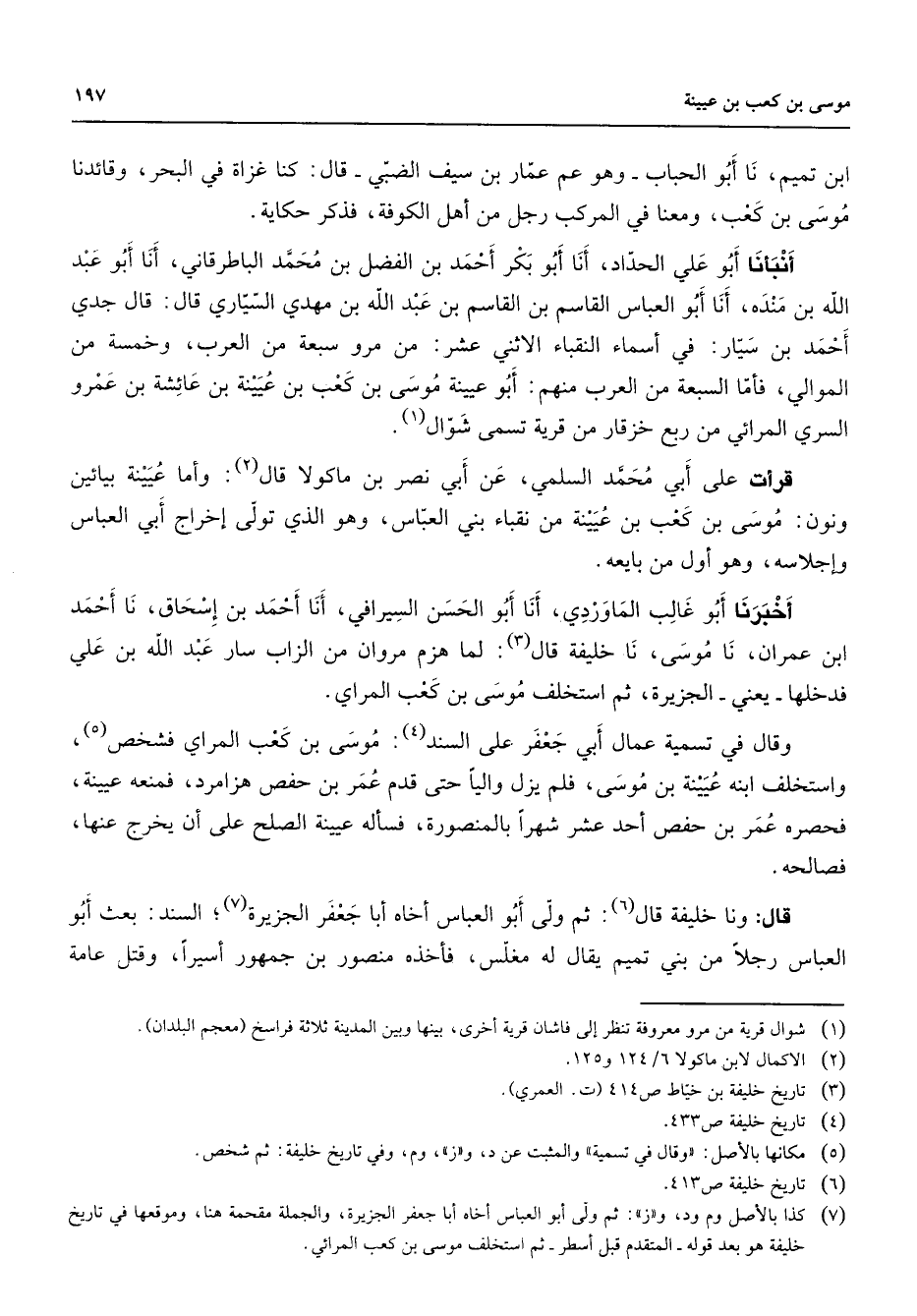 ابن تميم نا أبو الحباب وهو عم عمار بن سيف الضبي قال كنا غزاة في البحر وقائدنا موسى بن كعب ومعنا في المركب رجل من أهل الكوفة فذكر حكاية أنبأنا أبو علي الحداد أنا أبو بكر أحمد بن الفضل بن محمد الباطرقاني أنا أبو عبد الله بن منده أنا أبو العباس القاسم بن القاسم بن عبد الله بن مهدي السياري قال قال جدي أحمد بن سيار في اسماء النقباء الاثني عشر من مرو سبعة من العرب وخمسة من الموالي فأما السبعة من العرب منهم أبو عيينة موسى بن كعب بن عيينة بن عائشة بن عمرو السري المرائي من ربع خزقار من قرية تسمى شوال (1) قرأت على أبي محمد السلمي عن أبي نصر بن ماكولا قال (2) وأما عيينة بيائين ونون موسى بن كعب بن عيينة من نقباء بني العباس وهو الذي تولى إخراج أبي العباس وإجلاسه وهو أول من بايعه أخبرنا أبو غالب الماوردي أنا أبو الحسن السيرافي أنا أحمد بن إسحاق نا أحمد ابن عمران نا موسى نا خليفة قال (3) لما هزم مروان من الزاب سار عبد الله بن علي فدخلها يعني الجزيرة ثم استخلف موسى بن كعب المراي وقال في تسمية عمال أبي جعفر على السند (4) موسى بن كعب المراي فشخص (5) واستخلف ابنه عيينة بن موسى فلم يزل واليا حتى قدم عمر بن حفص هزامرد فمنعه عيينة فحصره عمر بن حفص أحد عشر شهرا بالمنصورة فسأله عيينة الصلح على أن يخرج عنها فصالحه قال ونا خليفة قال (6) ثم ولى أبو العباس أخاه أبا جعفر الجزيرة (7) السند بعث أبو العباس رجلا من بني تميم يقال له مغلس فأخذه منصور بن جمهور أسيرا وقتل عامة