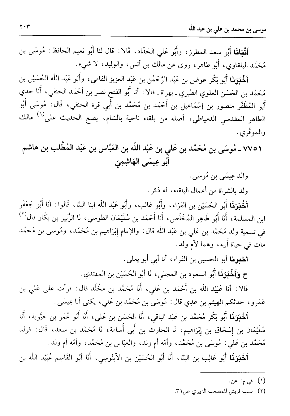 7751 - موسى بن محمد بن علي بن عبد الله بن العباس بن عبد المطلب بن هاشم أبو عيسى الهاشمي والد عيسى بن موسى ولد بالشراة من أعمال البلقاء له ذكر أخبرنا أبو الحسين بن الفراء وأبو غالب وأبو عبد الله ابنا البنا قالوا أنا أبو جعفر ابن المسلمة أنا أبو طاهر المخلص أنا أحمد بن سليمان الطوسي نا الزبير بن بكار قال (2) في تسمية ولد محمد بن علي بن عبد الله قال والإمام إبراهيم بن محمد وموسى بن محمد مات في حياة أبيه وهما لأم ولد أخبرنا أبو الحسين بن الفراء أنا أبي أبو يعلى ح وأخبرنا أبو السعود بن المجلي نا أبو الحسين بن المهتدي قالا أنا عبيد الله بن أحمد بن علي أنا محمد بن مخلد قال قرأت على علي بن عمرو حدثكم الهيثم بن عدي قال موسى بن محمد بن علي يكنى أبا عيسى أخبرنا أبو بكر محمد بن عبد الباقي أنا الحسن بن علي أنا أبو عمر بن حيوية أنا سليمان بن إسحاق بن إبراهيم نا الحارث بن أبي أسامة نا محمد بن سعد قال فولد محمد بن علي موسى بن محمد وأمه أم ولد والعباس بن محمد وأمه أم ولد أخبرنا أبو غالب بن البنا أنا أبو الحسين بن الآبنوسي أنا أبو القاسم عبيد الله بن