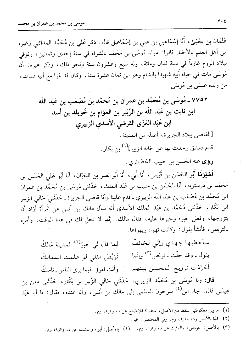 7752 - موسى بن محمد بن عمران بن محمد بن مصعب بن عبد الله ابن ثابت بن عبد الله بن الزبير بن العوام بن خويلد بن اسد ابن عبد العزى القرشي الأسدي الزبيري القاضي ببلاد الجزيرة اصله من المدينة قدم دمشق وحدث بها عن خاله الزبير (1) بن بكار روى عنه الحسن بن حبيب الحصائري أخبرنا أبو الحسن بن قبيس أنا أبي أنا أبو نصر بن الجبان أنا أبو علي الحسن بن محمد بن درستويه أنا الحسن بن حبيب بن عبد الملك حدثني موسى بن محمد بن عمران ابن محمد بن مصعب بن عبد الله الزبيري قدم علينا وأنا قاضي الجزيرة حدثني خالي الزبير ابن بكار حدثني محمد بن عبد الملك الأسدي أنه سأل مالك بن أنس عن امرأة أراد أن يتزوجها وقص خبره وخبرها عليه فقال مالك إنها لا تحل لك في هذا الوقت وأمره بالتربص فأنشأ يقول وكانت تهواه ويهواها * سأخطبها جهدي وإني لخائف * لما قال لي حبر (2) المدينة مالك يقول وقد حلت تربص (3) وإنما * تربص مثلي لو علمت المهالك أحرمت تزويج المحبين بينهم * وأنت امرؤ فيما يرى الناس ناسك * قال ونا موسى بن محمد الزبيري حدثني خالي الزبير بن بكار حدثني معن بن عيسى قال جاء ابن (4) سرحون السلمي إلى مالك بن أنس وأنا عنده فقال يا ابا عبد