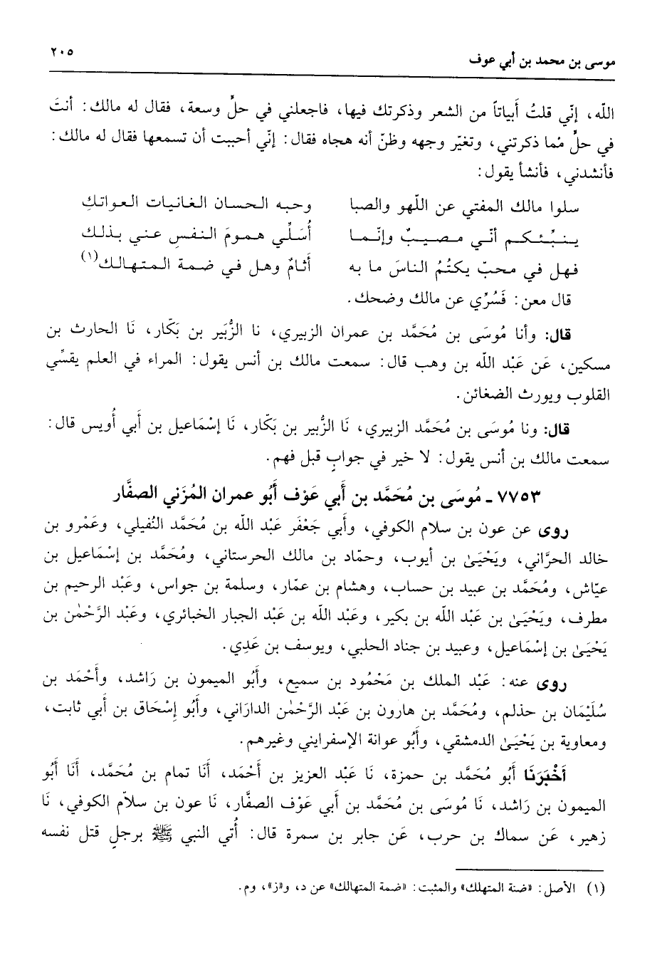 7753 - موسى بن محمد بن أبي عوف أبو عمران المزني الصفار روى عن عون بن سلام الكوفي وأبي جعفر عبد الله بن محمد النفيلي وعمرو بن خالد الحراني ويحيى بن أيوب وحماد بن مالك الحرستاني ومحمد بن إسماعيل بن عياش ومحمد بن عبيد بن حساب وهشام بن عمار وسلمة بن جواس وعبد الرحيم بن مطرف ويحيى بن عبد الله بن بكير وعبد الله بن عبد الجبار الخبائري وعبد الرحمن بن يحيى بن إسماعيل وعبيد بن جناد الحلبي ويوسف بن عدي روى عنه عبد الملك بن محمود بن سميع وأبو الميمون بن راشد وأحمد بن سليمان بن حذلم ومحمد بن هارون بن عبد الرحمن الداراني وأبو إسحاق بن أبي ثابت ومعاوية بن يحيى الدمشقي وأبو عوانة الإسفرايني وغيرهم أخبرنا أبو محمد بن حمزة نا عبد العزيز بن أحمد أنا تمام بن محمد أنا أبو الميمون بن راشد نا موسى بن محمد بن أبي عوف الصفار نا عون بن سلام الكوفي نا زهير عن سماك بن حرب عن جابر بن سمرة قال أتي النبي (صلى الله عليه وسلم) برجل قتل نفسه