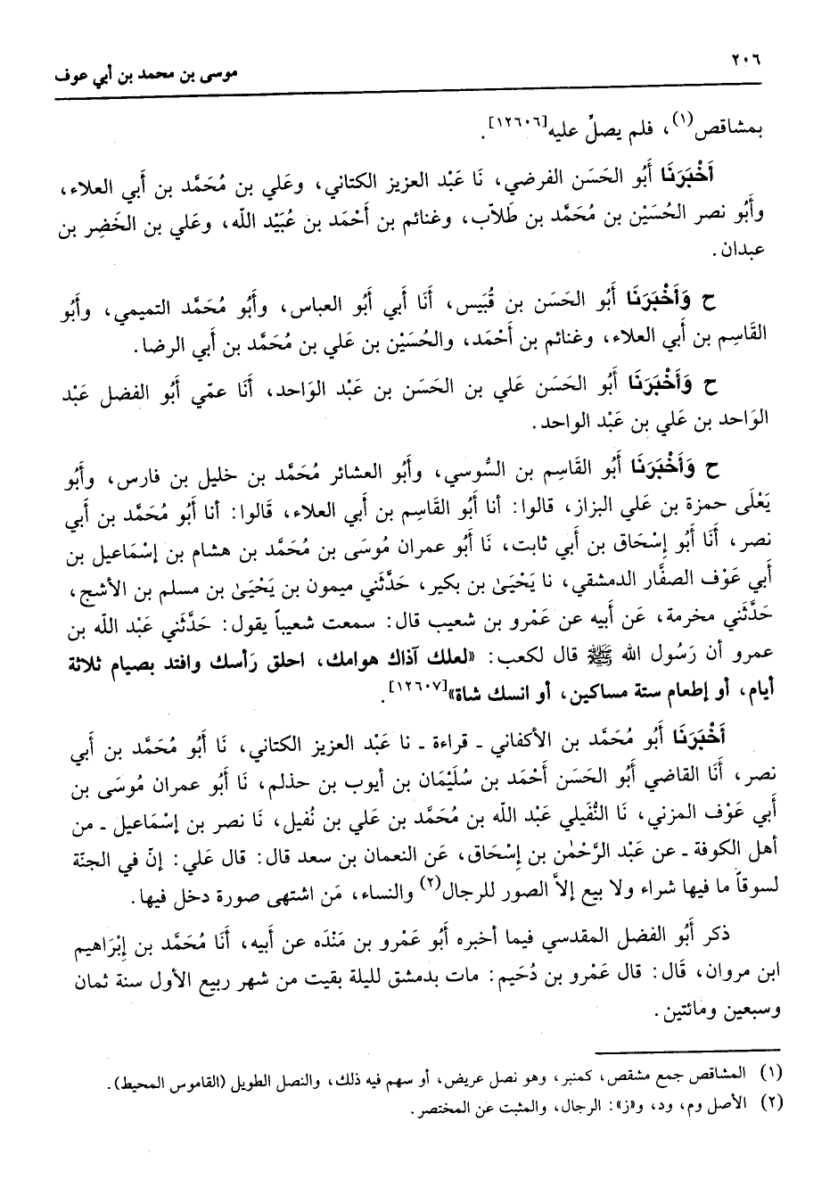 القاسم بن أبي العلاء وغنائم بن أحمد والحسين بن علي بن محمد بن أبي الرضا ح وأخبرنا أبو الحسن علي بن الحسن بن عبد الواحد أنا عمي أبو الفضل عبد الواحد بن علي بن عبد الواحد ح وأخبرنا أبو القاسم بن السوسي وأبو العشائر محمد بن خليل بن فارس وأبو يعلى حمزة بن علي البزاز قالوا أنا أبو القاسم بن أبي العلاء قالوا أنا أبو محمد بن أبي نصر أنا أبو إسحاق بن أبي ثابت نا أبو عمران موسى بن محمد بن هشام بن إسماعيل بن أبي عوف الصفار الدمشقي نا يحيى بن بكير حدثني ميمون بن يحيى بن مسلم بن الأشج حدثني مخرمة عن أبيه عن عمرو بن شعيب قال سمعت شعيبا يقول حدثني عبد الله بن عمرو أن رسول الله (صلى الله عليه وسلم) قال لكعب لعلك آذاك هوامك احلق رأسك وافتد بصيام ثلاثة أيام أو إطعام ستة مساكين أو انسك شاة أخبرنا أبو محمد بن الأكفاني قراءة نا عبد العزيز الكتاني نا أبو محمد بن أبي نصر أنا القاضي أبو الحسن أحمد بن سليمان بن أيوب بن حذلم نا أبو عمران موسى بن أبي عوف المزني نا النفيلي عبد الله بن محمد بن علي بن نفيل نا نصر بن إسماعيل من أهل الكوفة عن عبد الرحمن بن إسحاق عن النعمان بن سعد قال قال علي إن في الجنة لسوقا ما فيها شراء ولا بيع إلا الصور للرجال (2) والنساء من اشتهى صورة دخل فيها ذكر أبو الفضل المقدسي فيما أخبره أبو عمرو بن منده عن أبيه أنا محمد بن إبراهيم ابن مروان قال قال عمرو بن دحيم مات بدمشق لليلة بقيت من شهر ربيع الأول سنة ثمان وسبعين ومائتين