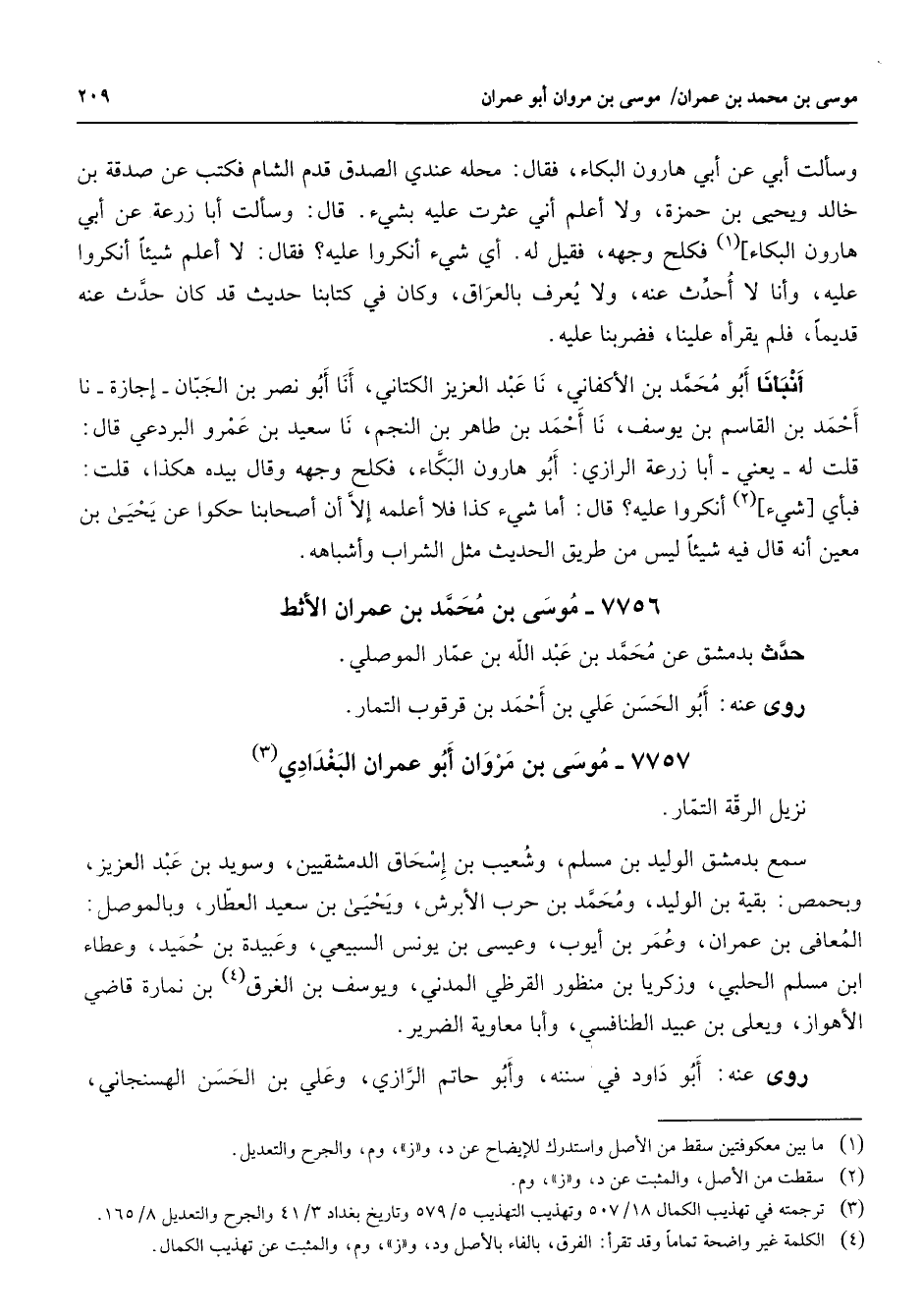 (3) ترجمته في تهذيب الكمال 18 / 507 وتهذيب التهذيب 5 / 579 وتاريخ بغداد 3 / 41 والجرح والتعديل 8 / 165