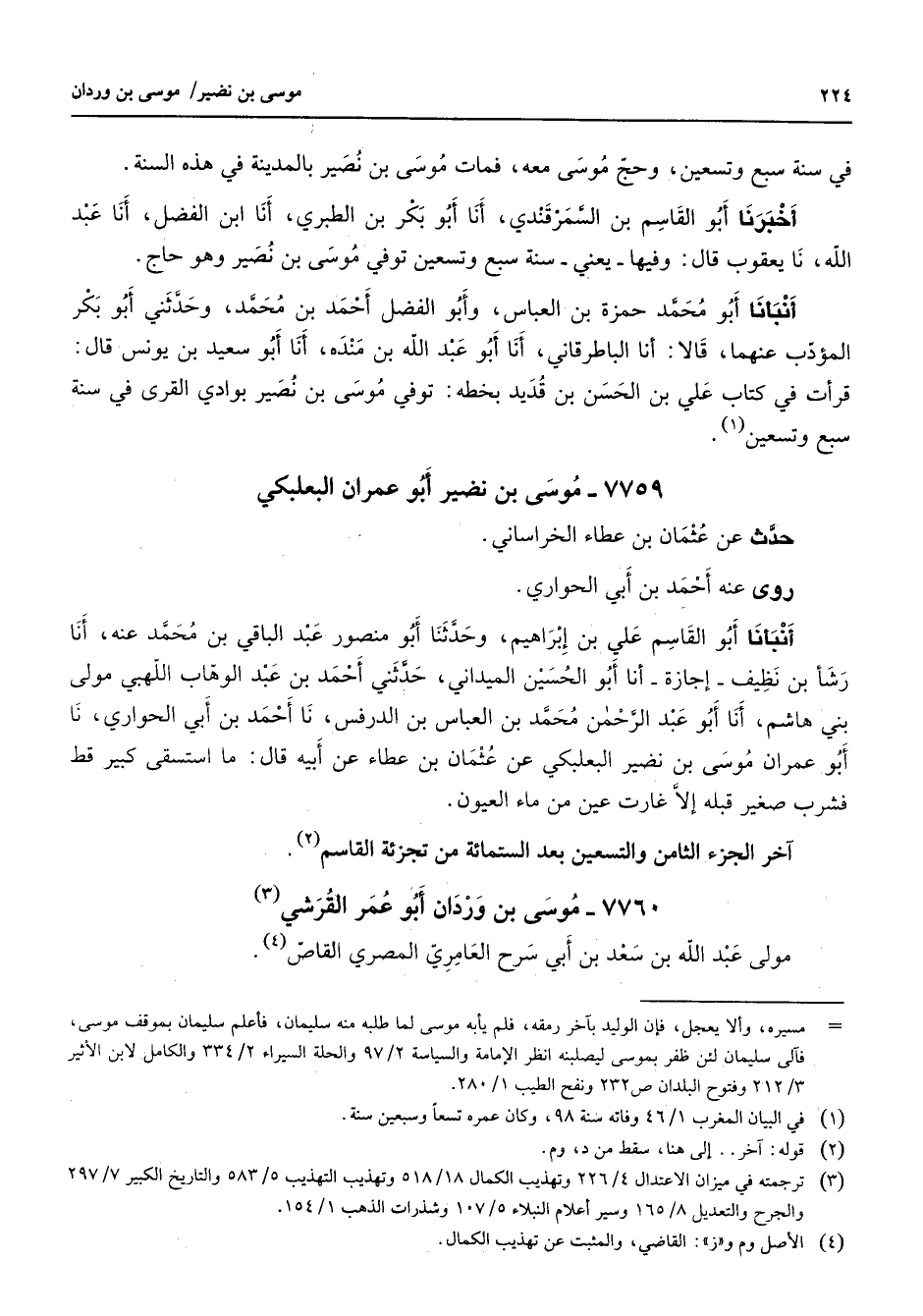 7759 - موسى بن نصير أبو عمران البعلبكي حدث عن عثمان بن عطاء الخراساني روى عنه أحمد بن أبي الحواري أنبأنا أبو القاسم علي بن إبراهيم وحدثنا أبو منصور عبد الباقي بن محمد عنه أنا رشأ بن نظيف إجازة أنا أبو الحسين الميداني حدثني أحمد بن عبد الوهاب اللهبي مولى بني هاشم أنا أبو عبد الرحمن محمد بن العباس بن الدرفس نا أحمد بن أبي الحواري نا أبو عمران موسى بن نضير البعلبكي عن عثمان بن عطاء عن أبيه قال ما استسقى كبير قط فشرب صغير قبله إلا غارت عين من ماء العيون آخر الجزء الثامن والتسعين بعد الستمائة من تجزئة القاسم (2)