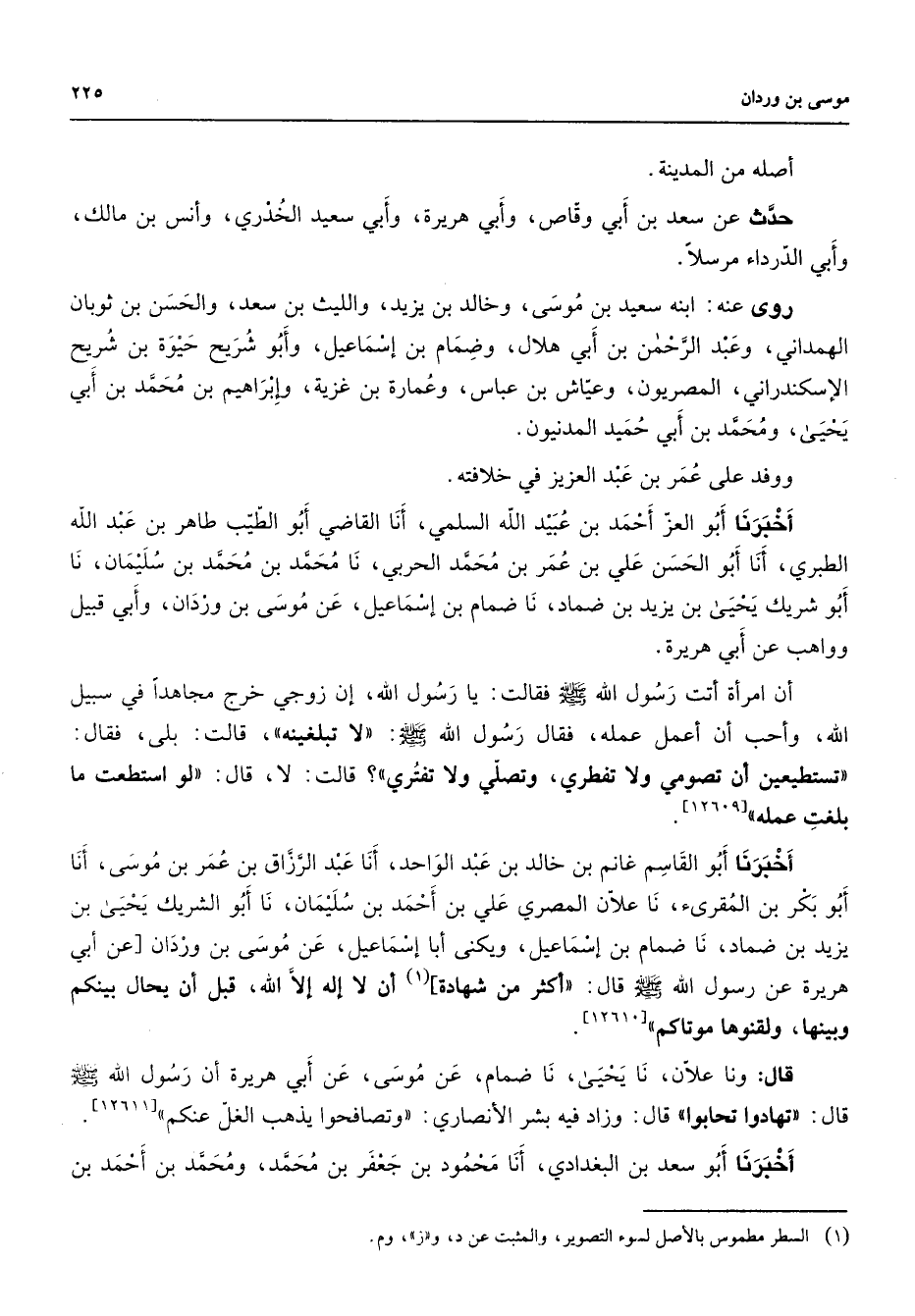 أصله من المدينة حدث عن سعد بن أبي وقاص وابي هريرة وأبي سعيد الخدري وأنس بن مالك وأبي الدرداء مرسلا روى عنه ابنه سعيد بن موسى وخالد بن يزيد والليث بن سعد والحسن بن ثوبان الهمداني وعبد الرحمن بن أبي هلال وضمام بن إسماعيل وابو شريح حيوة بن شريح الأسكندراني المصريون وعياش بن عباس وعمارة بن غزية وإبراهيم بن محمد بن ابي يحيى ومحمد بن أبي حميد المدنيون ووفد على عمر بن عبد العزيز في خلافته أخبرنا أبو العز أحمد بن عبيد الله السلمي أنا القاضي أبو الطيب طاهر بن عبد الله الطبري أنا أبو الحسن علي بن عمر بن محمد الحربي نا محمد بن محمد بن سليمان نا أبو شريك يحيى بن يزيد بن ضماد نا ضمام بن إساعيل عن موسى بن وردان وأبي قبيل وواهب عن أبي هريرة أن امرأة أتت رسول الله (صلى الله عليه وسلم) فقالت يا رسول الله إن زوجي خرج مجاهدا في سبيل الله وأحب أن أعمل عمله فقال رسول الله (صلى الله عليه وسلم) لا تبلغينه قالت بلى فقال تستطيعين أن تصومي ولا تفطري وتصلي ولا تفتري قالت لا قال لو استطعت ما بلغت عمله أخبرنا أبو القاسم غانم بن خالد بن عبد الواحد أنا عبد الرزاق بن عمر بن موسى أنا أبو بكر بن المقرئ نا علان المصري علي بن أحمد بن سليمان نا أبو الشريك يحيى بن يزيد بن ضماد نا ضمام بن إسماعيل ويكنى أبا إسماعيل عن موسى بن وردان عن أبي هريرة عن رسول الله (صلى الله عليه وسلم) قال أكثر من شهادة (1) أن لا إله إلا الله قبل أن يحال بينكم وبينها ولقنوها موتاكم قال ونا علان نا يحيى نا ضمام عن موسى عن أبي هريرة أن رسول الله (صلى الله عليه وسلم) قال تهادوا تحابوا قال وزاد فيه بشر الأنصاري وتصافحوا يذهب الغل عنكم أخبرنا أبو سعد بن البغدادي أنا محمود بن جعفر بن محمد ومحمد بن أحمد بن