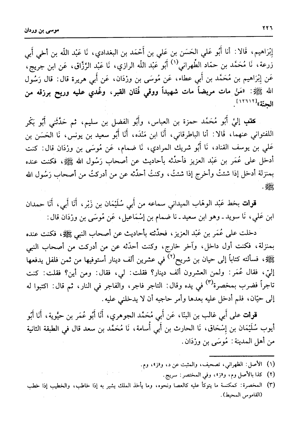 إبراهيم قالا أنا أبو علي الحسن بن علي بن أحمد بن البغدادي نا عبد الله بن أخي أبي زرعة نا محمد بن حماد الطهراني (1) أبو عبد الله الرازي نا عبد الرزاق عن ابن جريج عن إبراهيم بن محمد بن أبي عطاء عن موسى بن وردان عن أبي هريرة قال قال رسول الله (صلى الله عليه وسلم) من مات مريضا مات شهيدا ووقي فتان القبر وغدي عليه وريح برزقه من الجنة كتب إلي أبو محمد حمزة بن العباس وابو الفضل بن سليم ثم حدثني أبو بكر اللفتواني عنهما قالا أنا الباطرقاني أنا ابن منده أنا أبو سعيد بن يونس نا الحسن بن علي بن يوسف القناد نا أبو شريك المرادي نا ضمام عن موسى بن وردان قال كنت أدخل على عمر بن عبد العزيز فأحدثه بأحاديث عن أصحاب رسول الله (صلى الله عليه وسلم) فكنت عنده بمنزلة أدخل إذا شئت وأخرج إذا شئت وكنت أحدثه عن من أدركت من أصحاب رسول الله (صلى الله عليه وسلم) قرأت بخط عبد الوهاب الميداني سماعه من أبي سليمان بن زبر أنا ابي أنا حمدان ابن علي نا سويد وهو ابن سعيد نا ضمام بن إسماعيل عن موسى بن وردان قال دخلت على عمر بن عبد العزيز فحدثته بأحاديث عن أصحاب النبي (صلى الله عليه وسلم) فكنت عنده بمنزلة فكنت أول داخل وآخر خارج وكنت أحدثه عن من أدركت من أصحاب النبي (صلى الله عليه وسلم) فسألته كتابا إلى حيان بن شريح (2) في عشرين ألف دينار أستوفيها من ثمن فلفل يدفعها إلي فقال عمر ولمن العشرون ألف دينار فقلت لي فقال ومن أين فقلت كنت تاجرا فضرب بمخصرة (3) في يده وقال التاجر فاجر والفاجر في النار ثم قال اكتبوا له إلى حيان فلم أدخل عليه بعدها وأمر حاجبه أن لا يدخلني عليه قرأت على أبي غالب بن البنا عن أبي محمد الجوهري أنا أبو عمر بن حيوية أنا أبو أيوب سليمان بن إسحاق نا الحارث بن أبي أسامة نا محمد بن سعد قال في الطبقة الثانية من أهل المدينة موسى بن وردان