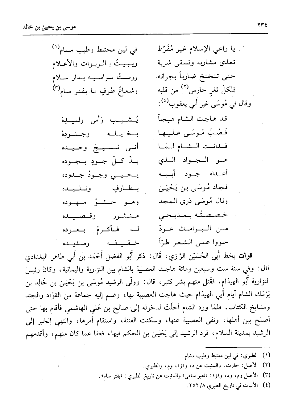 * يا راعي الإسلام غير مفرط * في لين محتبط وطيب مسام (1) تعذى مشاربه وتسقى شربة * ويبيت بالربوات والأعلام حتى تنخنخ ضاربا بجرانه * ورست مراسيه بدار سلام فلكل ثغر حارس (2) من قلبه * وشعاع طرف ما يفتر سام * (3) وقال في موسى غير أبي يعقوب (4) * قد هاجت الشام هيجا * يشيب رأس وليدة فصب موسى عليها * بخيله وجنوده فدانت الشام لما * أتى نسيج وحيده هو الجواد الذي * بذ كل جود بجوده أعداه جود أبيه * يحيى وجود جدوده فجاد موسى بن يحيى * بطارف وتليده ونال موسى ذرى المجد * وهو حشو مهوده خصصته بمديحي * منثور وقصيده من البرامك عود * له فأكرم بعوده حووا على الشعر طرا * خفيفه ومديده * قرأت بخط أبي الحسين الرازي قال ذكر أبو الفضل أحمد بن أبي طاهر البغدادي قال وفي سنة ست وسبعين ومائة هاجت العصبية بالشام بين النزارية واليمانية وكان رئيس النزارية أبو الهيذام فقتل منهم بشر كثير قال وولى الرشيد موسى بن يحيى بن خالد بن برمك الشام أيام أبي الهيذام حيث هاجت العصبية بها وضم إليه جماعة من القواد والجند ومشايخ الكتاب فلما ورد الشام أحلت لدخوله إلى صالح بن علي الهاشمي فأقام بها حتى أصلح بين أهلها ونفى العصبية عنها وسكنت الفتنة واستقام أمرها وانتهى الخبر إلى الرشيد بمدينة السلام فرد الرشيد إلى يحيى بن الحكم فيها فعفا عما كان منهم وأقدمهم
