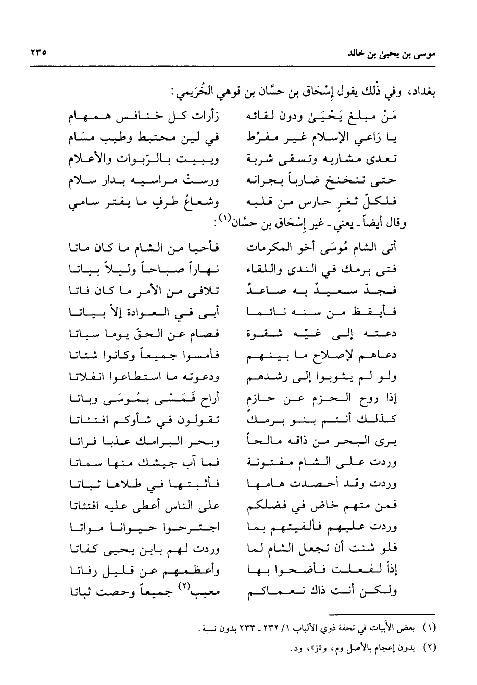 بغداد وفي ذلك يقول إسحاق بن حسان بن قوهي الخريمي * من مبلغ يحيى ودون لقائه * زأرت كل خنافس همهام يا راعي الإسلام غير مفرط * في لين محتبط وطيب مسام تعدى مشاربه وتسقى شربة * ويبيت بالربوات والأعلام حتى تنخنخ ضاربا بجرانه * ورست مراسيه بدار سلام فلكل ثغر حارس من قلبه * وشعاع طرف ما يفتر سامي * وقال أيضا يعني غير إسحاق بن حسان (1) * أتى الشام موسى أخو المكرمات * فأحيا من الشام ما كان ماتا فتى برمك في الندى واللقاء * نهارا صباحا وليلا بياتا فجد سعيد به صاعد * تلافى من الأمر ما كان فاتا فأيقظ من سنه نائما * أبى في العوادة إلا بياتا دعته إلى غيه شقوة * فصام عن الحق يوما سباتا دعاهم لإصلاح ما بينهم * فأمسوا جميعا وكانوا شتاتا ولو لم يثوبوا إلى رشدهم * ودعوته ما استطاعوا انفلاتا إذا روح الحزم عن حازم * أراح فمسى بموسى وباتا كذلك أنتم بنو برمك * تقولون في شأوكم افتئاتا يرى البحر من ذاقه مالحا * وبحر البرامك عذبا فراتا وردت على الشام مفتونة * فما آب جيشك منها سماتا وردت وقد أحصدت هامها * فأثبتها في طلاها ثباتا فمن متهم خاض في فضلكم * على الناس أعطى عليه افتئاتا وردت عليهم فألفيتهم بما * اجترحوا حيوانا مواتا فلو شئت أن تجعل الشام لما * وردت لهم بابن يحيى كفاتا إذا لفعلت فأضحوا بها * وأعظمهم عن قليل رفاتا ولكن أنت ذاك نعماكم * معبب (2) جميعا وحصت ثباتا