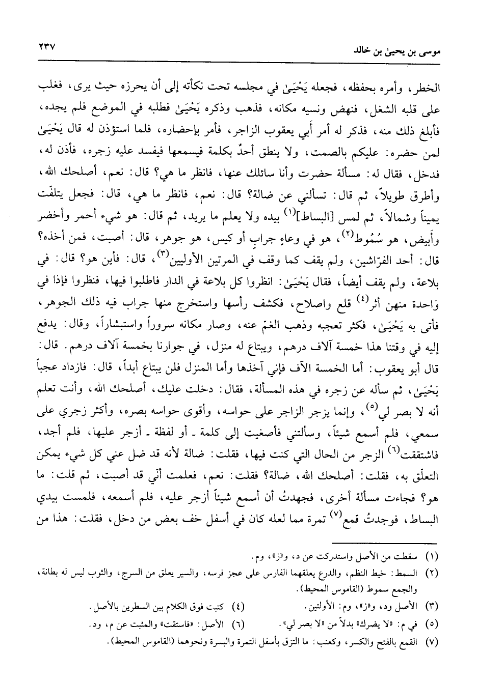 الخطر وأمره بحفظه فجعله يحيى في مجلسه تحت نكأته إلى أن يحرزه حيث يرى فغلب على قلبه الشغل فنهض ونسيه مكانه فذهب وذكره يحيى فطلبه في الموضع فلم يجده فأبلغ ذلك منه فذكر له أمر أبي يعقوب الزاجر فأمر بإحضاره فلما استؤذن له قال يحيى لمن حضره عليكم بالصمت ولا ينطق أحد بكلمة فيسمعها فيفسد عليه زجره فأذن له فدخل فقال له مسألة حضرت وأنا سائلك عنها فانظر ما هي قال نعم أصلحك الله وأطرق طويلا ثم قال تسألني عن ضالة قال نعم فانظر ما هي قال فجعل يتلفت يمينا وشمالا ثم لمس البساط (1) بيده ولا يعلم ما يريد ثم قال هو شئ أحمر وأخضر وأبيض هو سموط (2) هو في وعاء جراب أو كيس هو جوهر قال أصبت فمن أخذه قال أحد الفراشين ولم يقف كما وقف في المرتين الأوليين (3) قال فأين هو قال في بلاعة ولم يقف أيضا فقال يحيى انظروا كل بلاعة في الدار فاطلبوا فيها فنظروا فإذا في واحدة منهن أثر (4) قلع وإصلاح فكشف رأسها واستخرج منها جراب فيه ذلك الجوهر فأتى به يحيى فكثر تعجبه وذهب الغم عنه وصار مكانه سرورا واستبشارا وقال يدفع إليه في وقتنا هذا خمسة آلاف درهم ويبتاع له منزل في جوارنا بخمسة آلاف درهم قال قال أبو يعقوب أما الخمسة آلاف فإني آخذها وأما المنزل فلن يبتاع أبدا قال فازداد عجبا يحيى ثم سأله عن زجره في هذه المسألة فقال دخلت عليك أصلحك الله وأنت تعلم أنه لا بصر لي (5) وإنما يزجر الزاجر على حواسه وأقوى حواسه بصره وأكثر زجري على سمعي فلم أسمع شيئا وسألتني فأصغيت إلى كلمة أو لفظة أزجر عليها فلم أجد فاشتققت (6) الزجر من الحال التي كنت فيها فقلت ضالة لأنه قد ضل عني كل شئ يمكن التعلق به فقلت أصلحك الله ضالة فقلت نعم فعلمت أني قد أصبت ثم قلت ما هو فجاءت مسألة أخرى فجهدت أن أسمع شيئا أزجر عليه فلم أسمعه فلمست بيدي البساط فوجدت قمع (7) تمرة مما لعله كان في أسفل خف بعض من دخل فقلت هذا من