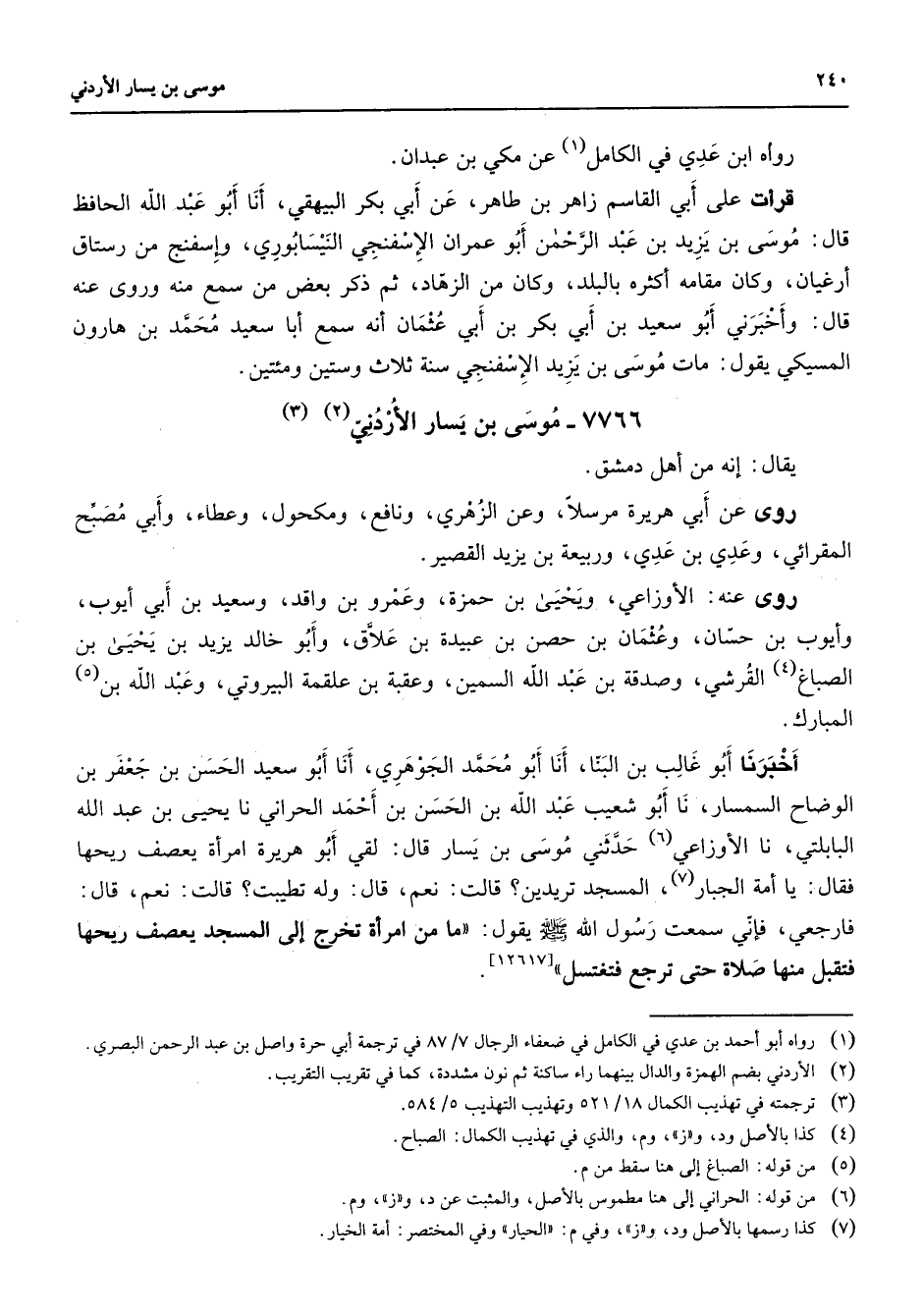 7766 - موسى بن يسار الأردني (2) (3) يقال إنه من أهل دمشق روى عن أبي هريرة مرسلا وعن الزهري ونافع ومكحول وعطاء وأبي مصبح المقرائي وعدي بن عدي وربيعة بن يزيد القصير روى عنه الأوزاعي ويحيى بن حمزة وعمرو بن واقد وسعيد بن أبي أيوب وأيوب بن حسان وعثمان بن حصن بن عبيدة بن علاق وأبو خالد يزيد بن يحيى بن الصباغ (4) القرشي وصدقة بن عبد الله السمين وعقبة بن علقمة البيروتي وعبد الله بن (5) المبارك أخبرنا أبو غالب بن البنا أنا أبو محمد الجوهري أنا أبو سعيد الحسن بن جعفر بن الوضاح السمسار نا أبو شعيب عبد الله بن الحسن بن أحمد الحراني نا يحيى بن عبد الله البابلتي نا الأوزاعي (6) حدثني موسى بن يسار قال لقي أبو هريرة امرأة يعصف ريحها فقال يا أمة الجبار (7) المسجد تريدن قالت نعم قال وله تطيبت قالت نعم قال فارجعي فإني سمعت رسول الله (صلى الله عليه وسلم) يقول ما من امرأة تخرج إلى المسجد يعصف ريحها فتقبل منها صلاة حتى ترجع فتغتسل